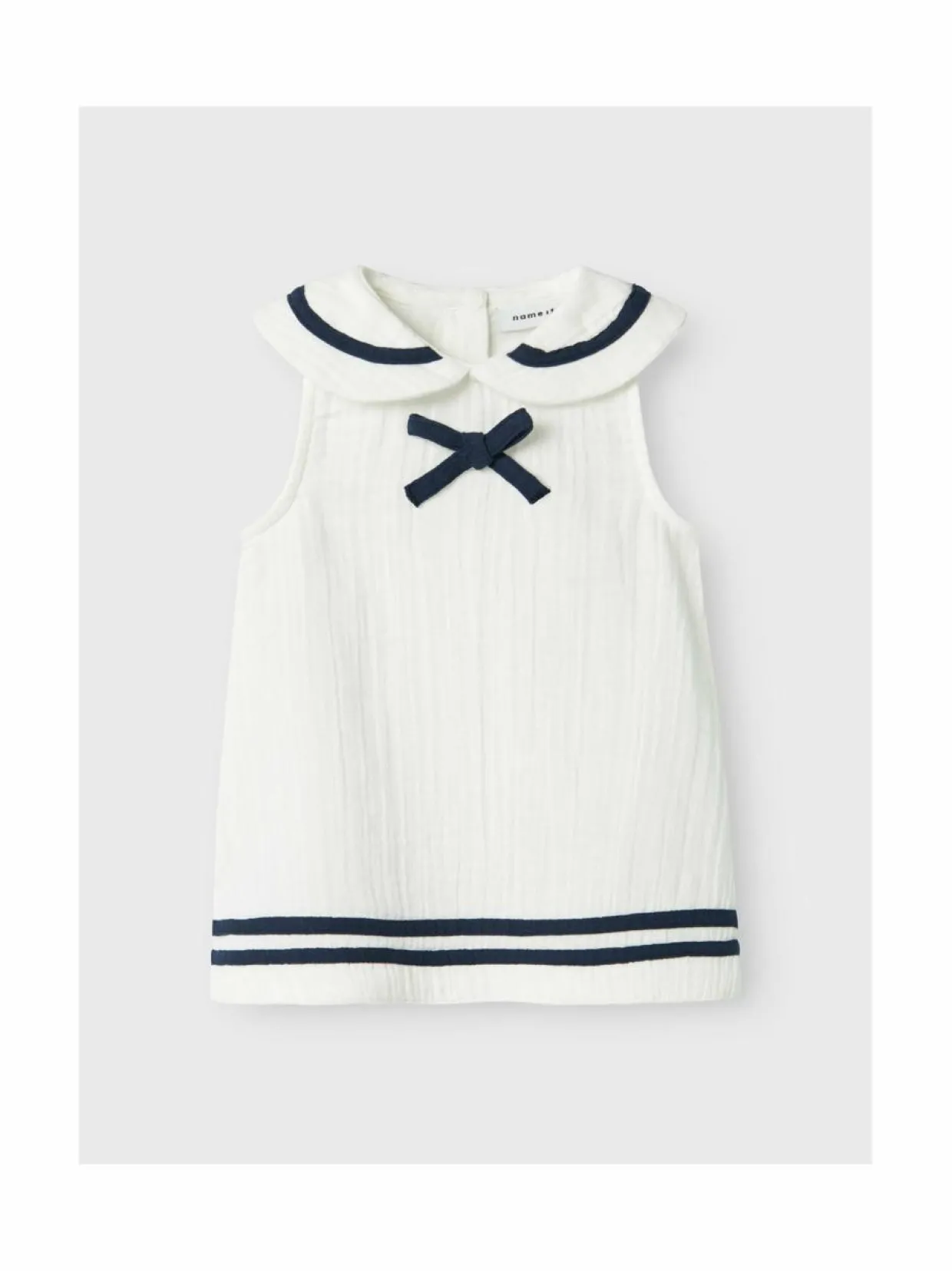 NAME IT -merkin söpö mekko on valmistettu pehmeästä ja hengittävästä puuvillasta. Mekossa on kaunis merimieshenkinen kaulus ja raidoitus. Rusetti on solmittu kauniisti eteen. Tämä mekko sopii täydellisesti kesäpäiviin.