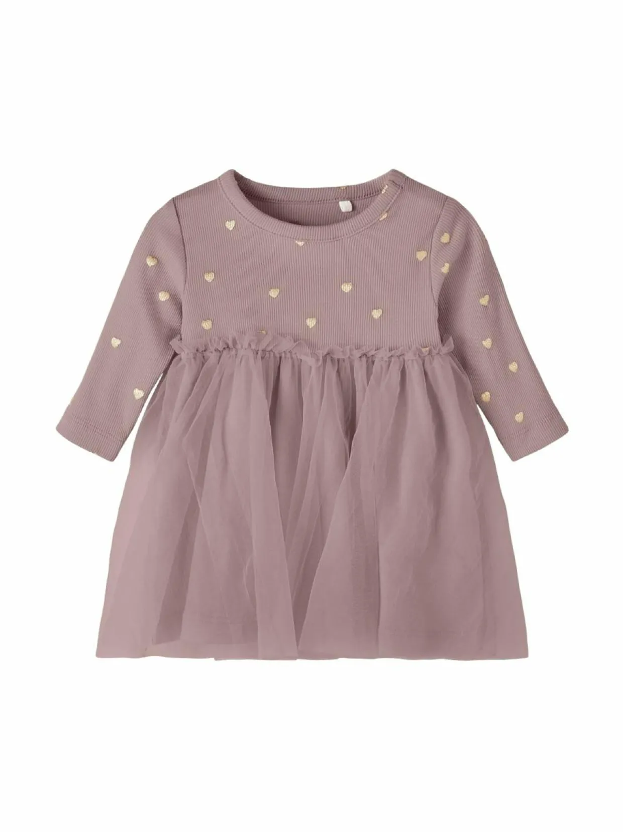 NAME IT -merkin trikoomekko on valmistettu pehmeästä luomupuuvillasekoitteesta. Runsas tyllikerros helmassa ja kullanhohtoinen sydänprintti tekevät mekosta vastustamattoman suloisen.