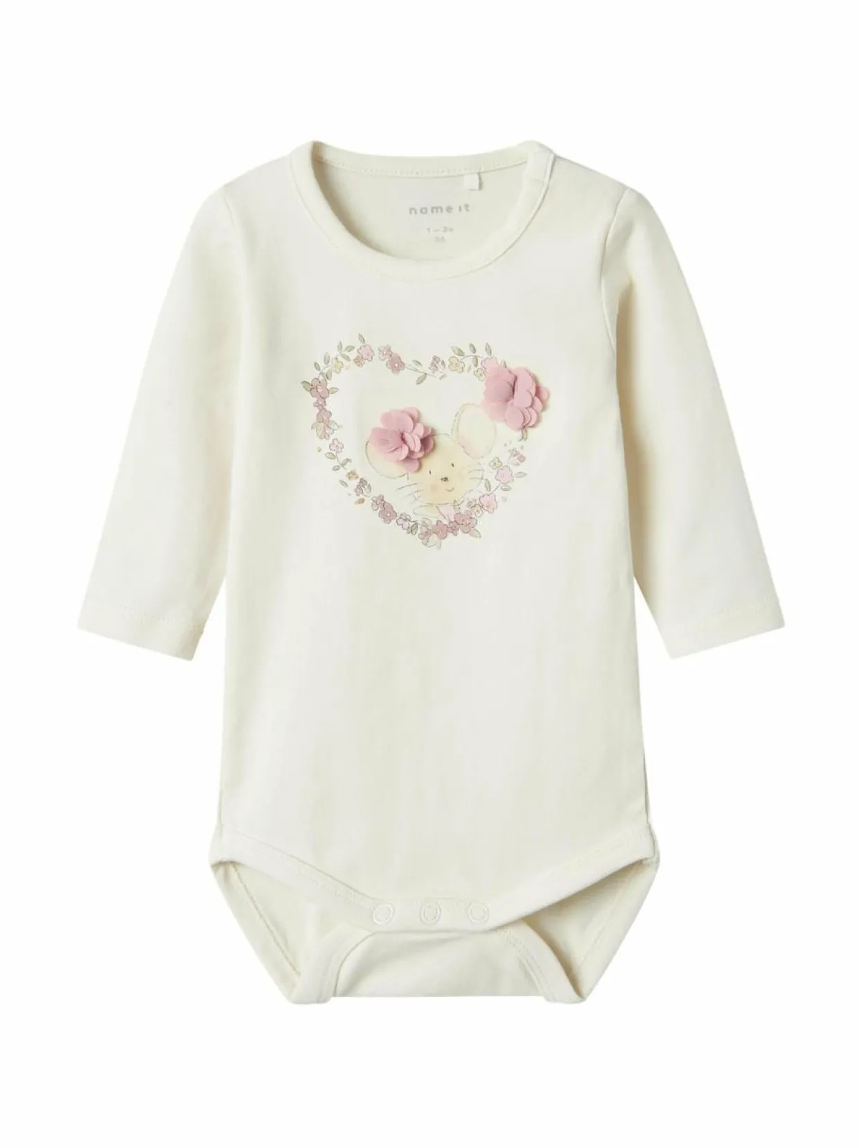 Name It -merkin pitkähihaisessa bodyssa on suloinen hiirikuvio ja 3D-kukka-applikaatioita. Pehmeä puuvillasekoite tuntuu miellyttävältä ihoa vasten, ja elastaani tuo lisää joustavuutta. Nepparit haaraosassa helpottavat pukemista ja vaipanvaihtoa.
