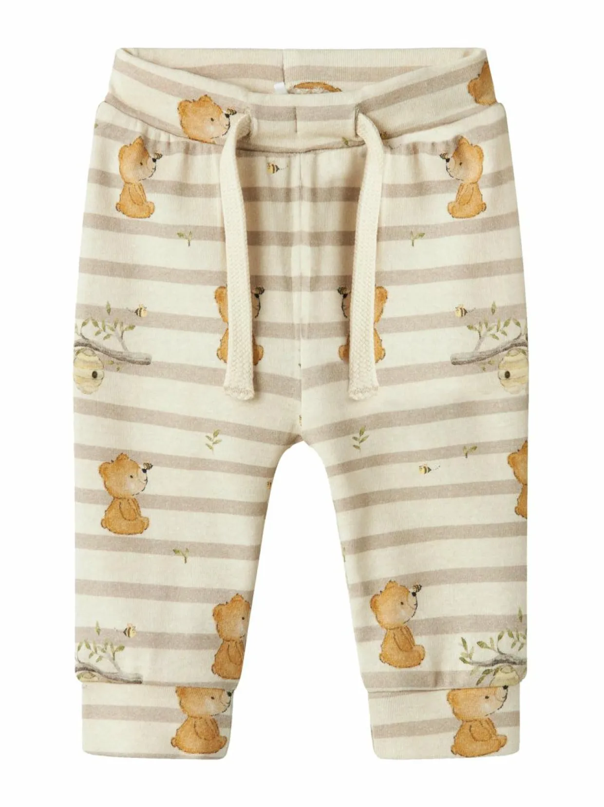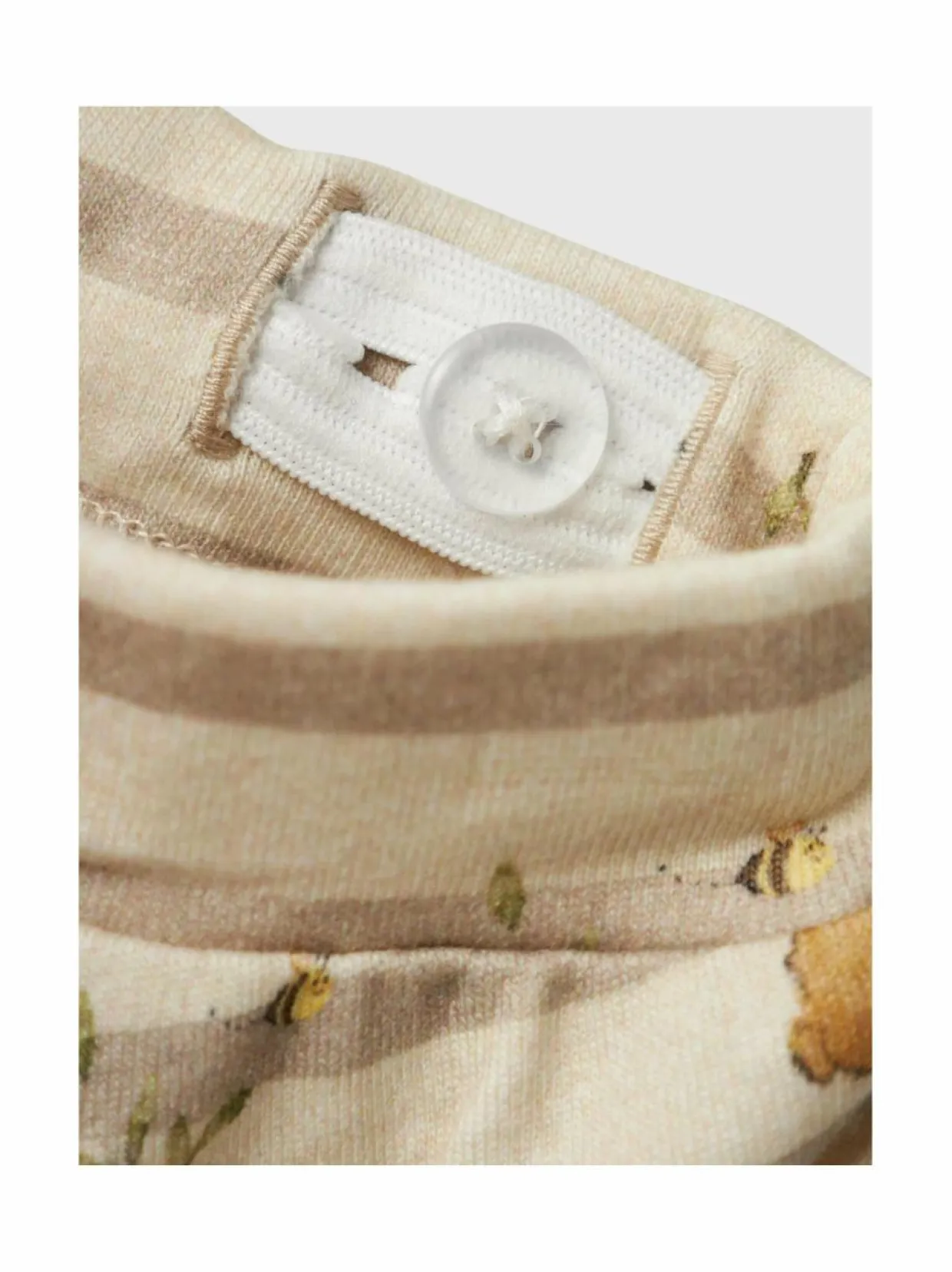 Name It -merkin raitahousuissa on suloinen nallekuosi. Pehmeä puuvillan ja lyocellin sekoite tuntuu miellyttävältä ihoa vasten, ja elastaani lisää joustavuutta. Vyötäröllä on kiristysnauha, jolla housut saa säädettyä hyvin istuviksi, ja lahkeensuissa on resorit, jotka pitävät housut mukavasti paikoillaan.