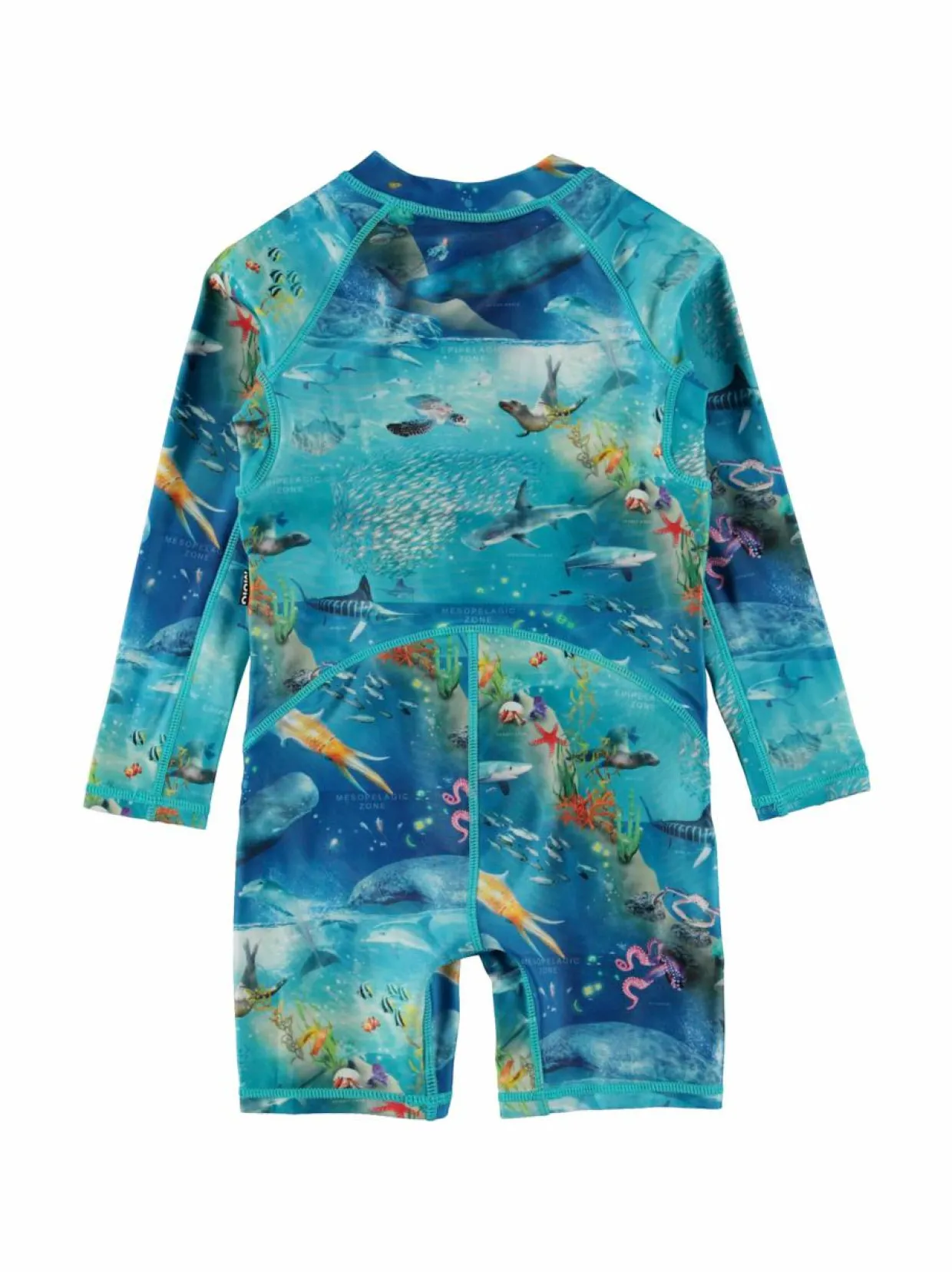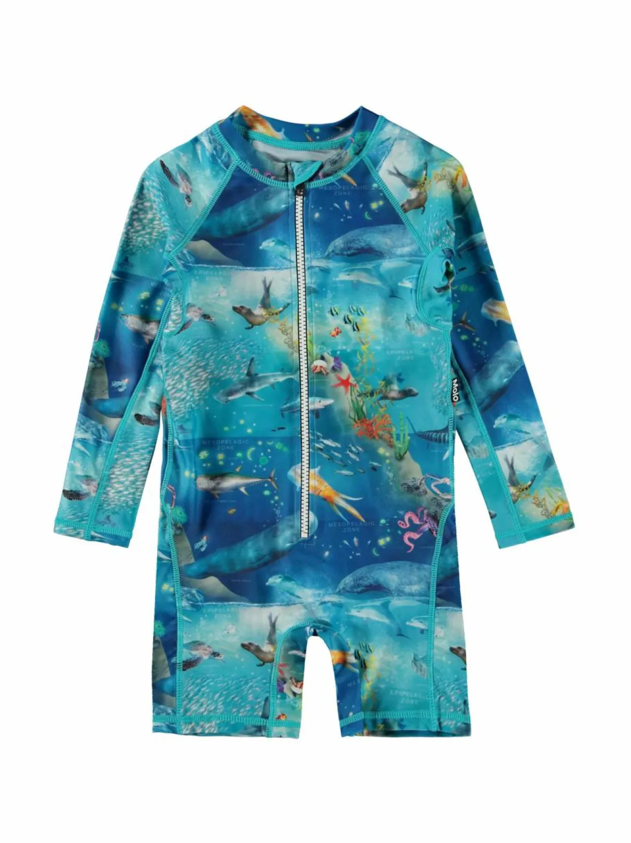 Joustava UV-suojattu (UV-suoja 50+) uimapuku hienossa Ocean Zones -kuosissa. Pitkä vetoketju edessä helpottaa uima-asun pukemista.