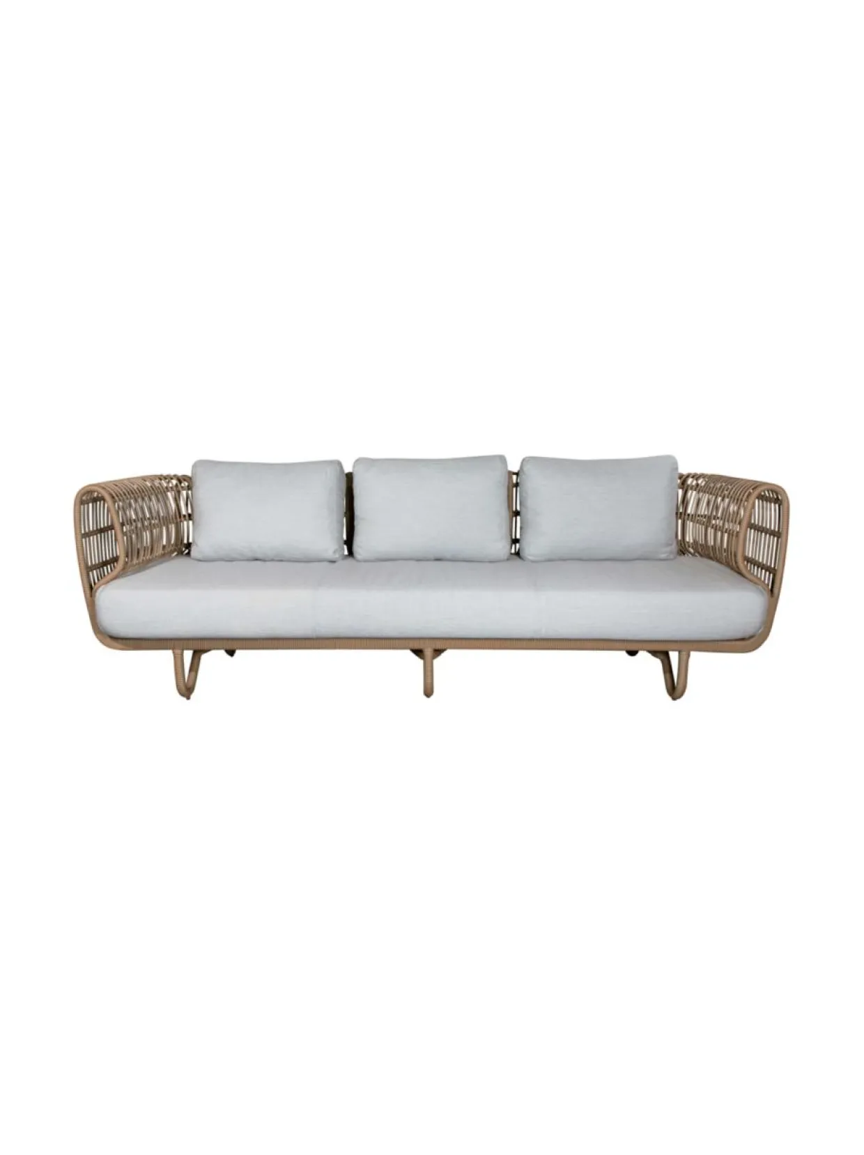 Ajaton ja kestävä Nest-kolmen istuttava sohva ulkokäyttöön. 226,5 cm lev, 83 cm syv, 74 cm kork, 42 cm istuinkork. Vaalean harmaat Cane-line Natté selkänojatyynyt ja istuintyyny sisältyvät hintaan. Luonnonvärinen Cane-line Weave-punos ja alumiinirunko.