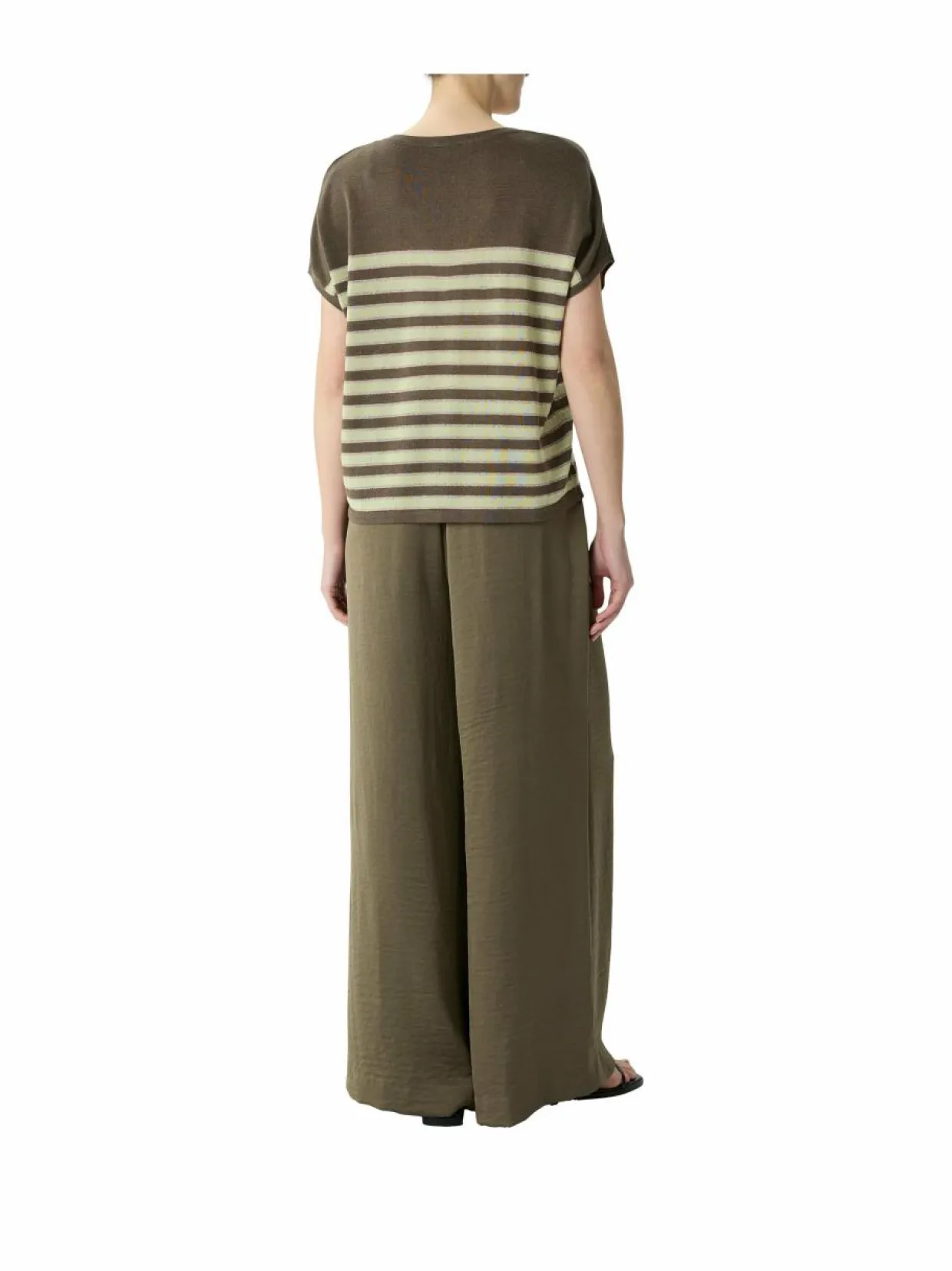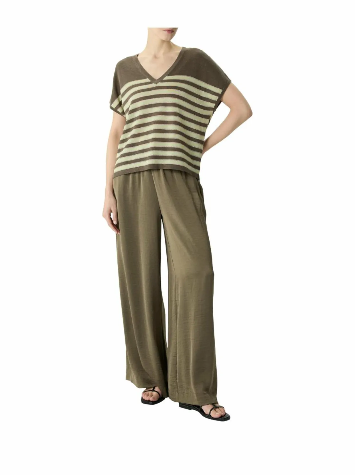 Tämä neulepusero on valmistettu pehmeästä ja hengittävästä materiaalista, joka tuntuu miellyttävältä iholla. Sen v-pääntie ja lyhyet hihat luovat rentoa ilmettä. Raitakuviointi antaa puserolle dynaamisuutta ja tämä pusero sopii täydellisesti sekä arkeen että juhlaankin, lisäksi se on helppo yhdistää eri alaosien kanssa. Materiaali on helppohoitoinen ja kestää hyvin käyttöä.