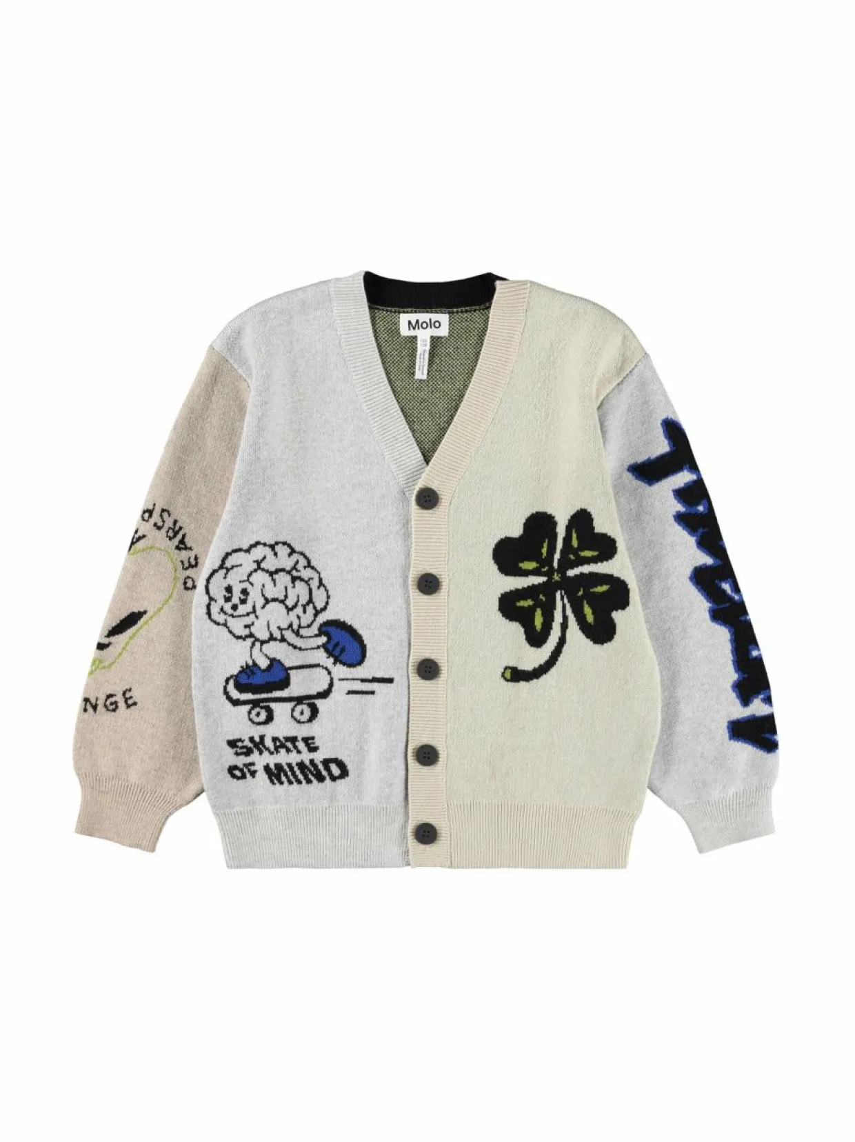 Uniikki rennonmallinen neuletakki Mololta. V-kauluksinen napitettava neuletakki tarjoaa mukavuutta ja lämpöä päivittäisessä käytössä. Materiaali yhdistää puuvillan hengittävyyden ja villan lämmittävät ominaisuudet.