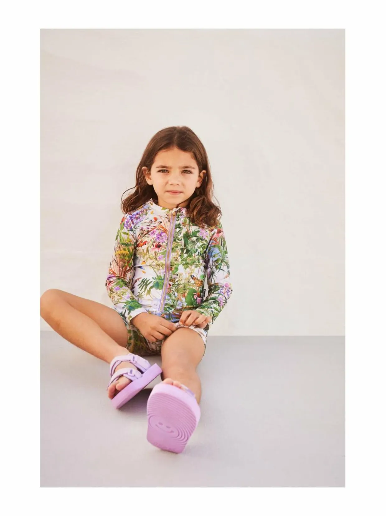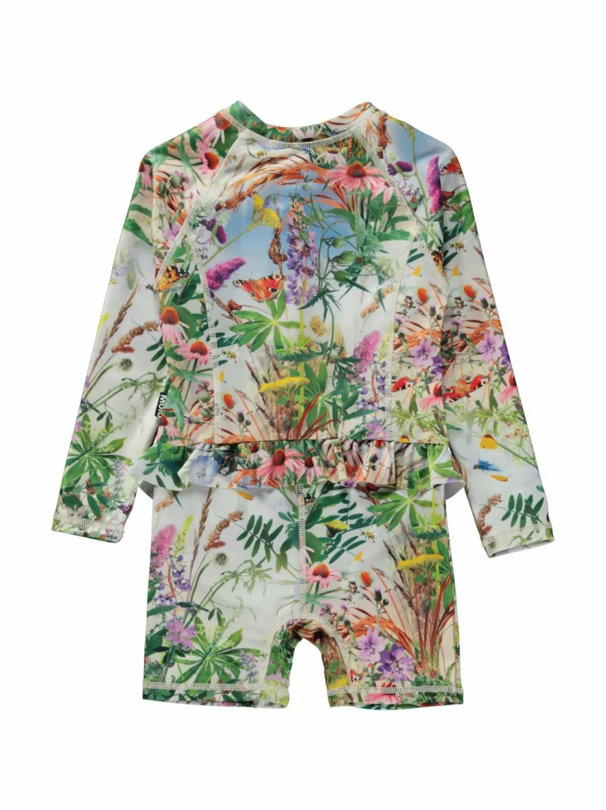 Joustava UV-suojattu (UV-suoja 50+) uimapuku hienossa Wild Nature -kuosissa. Pitkä vetoketju edessä helpottaa uima-asun pukemista. Mukavat raglanhihat ja röyhelöreunus viimeistelevät tyylin.