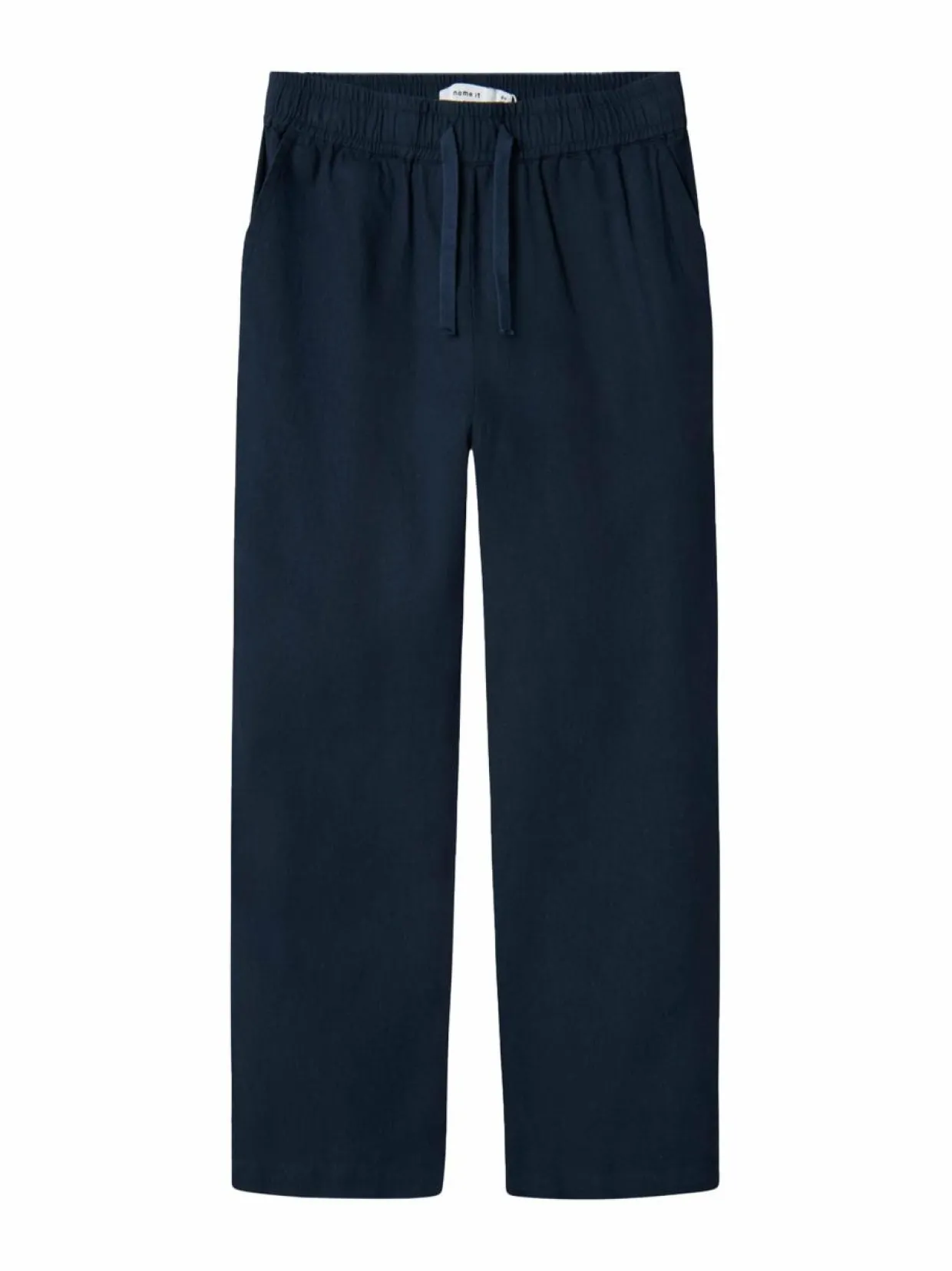 Nämä Name It -merkin NkfFallinen-housut ovat mukavat ja käytännölliset. Housut ovat valmistettu pehmeästä puuvilla-pellavasekoitteesta, joka hengittää hyvin ja tuntuu miellyttävältä iholla. Housuissa on joustava vyötärö, jossa on solmittava kiristysnauha. Housut sopivat täydellisesti arkikäyttöön ja ne ovat helppo yhdistää muihin vaatteisiin. Puuvilla on luonnollinen materiaali, joka on pehmeää ja hengittävää. Se on myös kestävä ja helppohoitoinen. Pellava on luonnollinen materiaali, joka on hengittävää ja viilentävää.