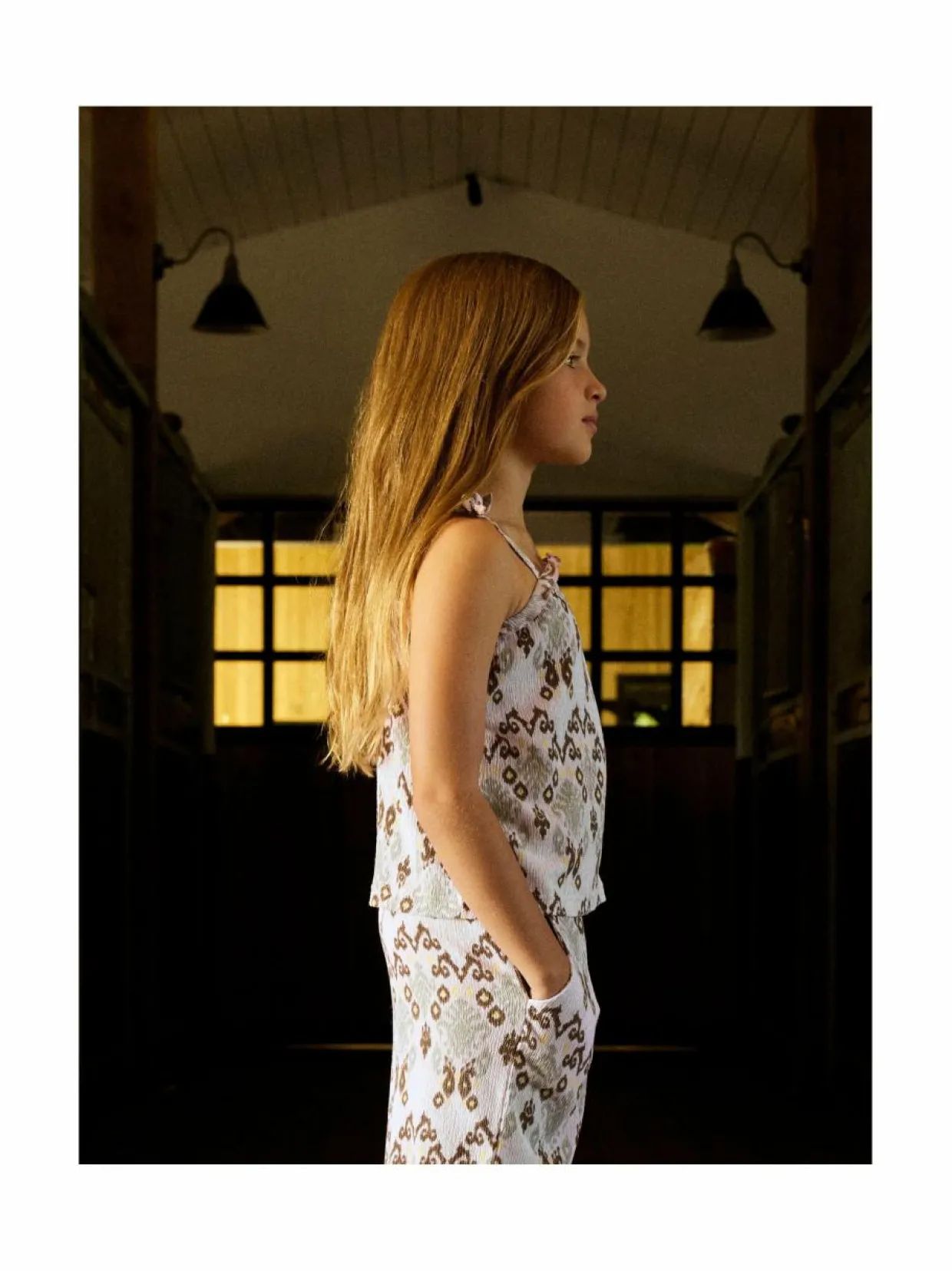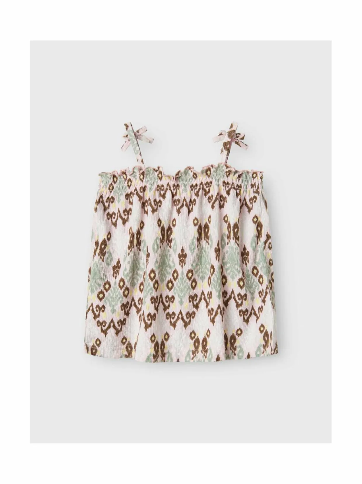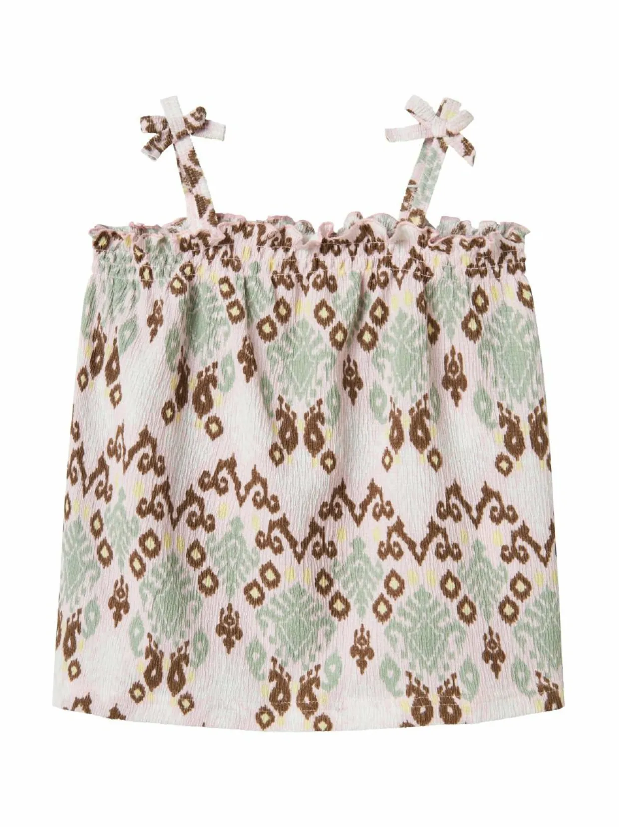 Kevyt ja joustava toppi, jossa on ohuet olkaimet ja yksinkertainen muotoilu. Toppi on valmistettu joustavasta polyesterin ja elastaanin sekoituksesta, mikä takaa miellyttävän tunteen ihoa vasten ja hyvän liikkuvuuden. Polyesteri tuo toppiin kestävyyttä ja auttaa sitä säilyttämään muotonsa, kun taas elastaani antaa sille lisäjoustoa. Topin ilmava ja kevyt materiaali tekee siitä täydellisen lämpimiin päiviin.