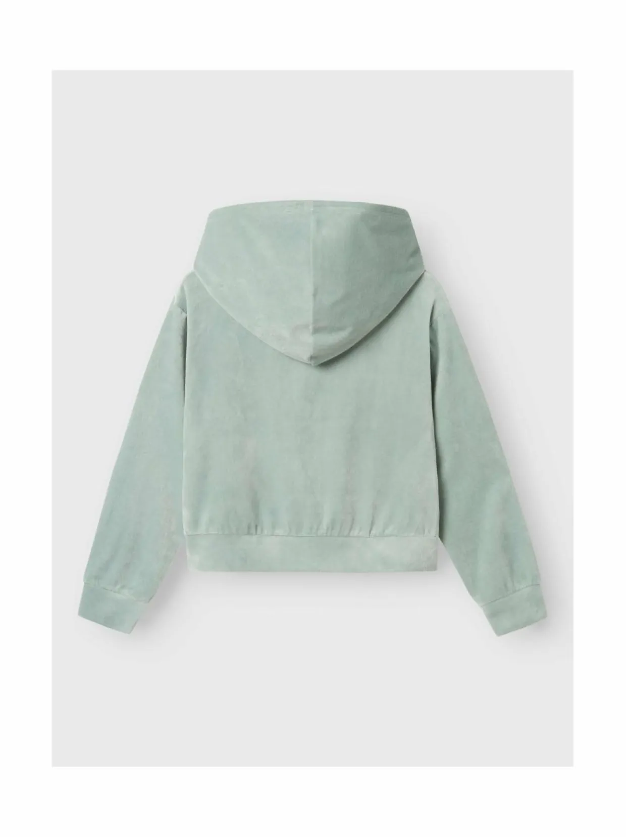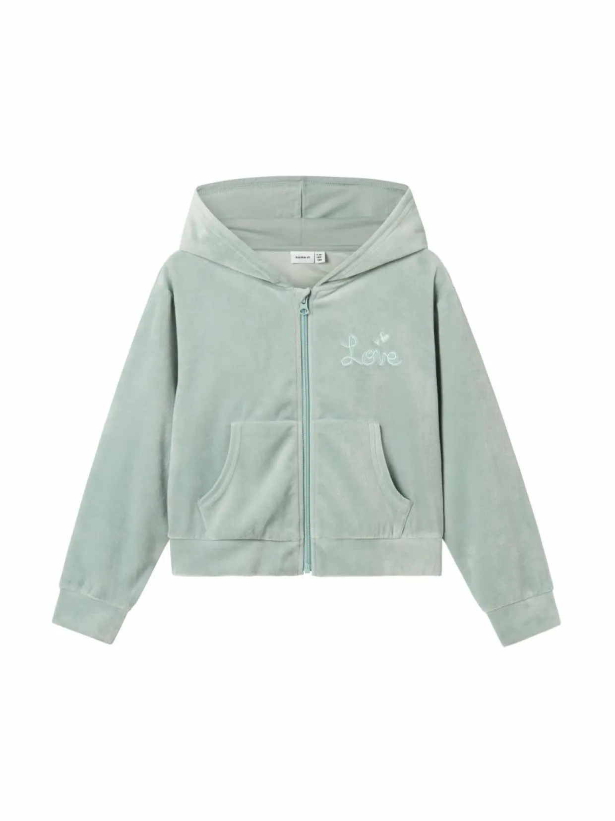 Lasten samettisen pehmeä hupparitakki tekstibrodeerauksella. Edessä on vetoketjusulku leukasuojalla sekä taskut. Samettihuppari on suunniteltu normaalilla istuvuudella.