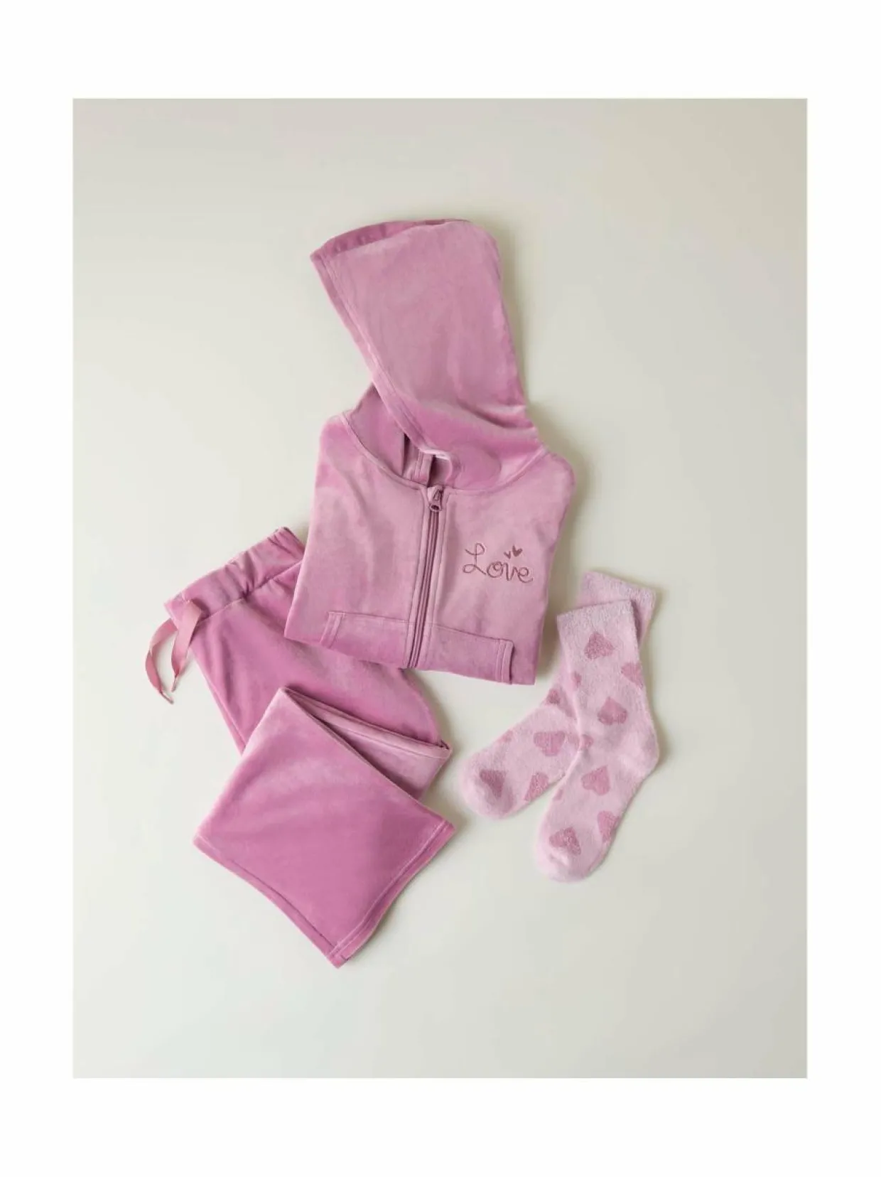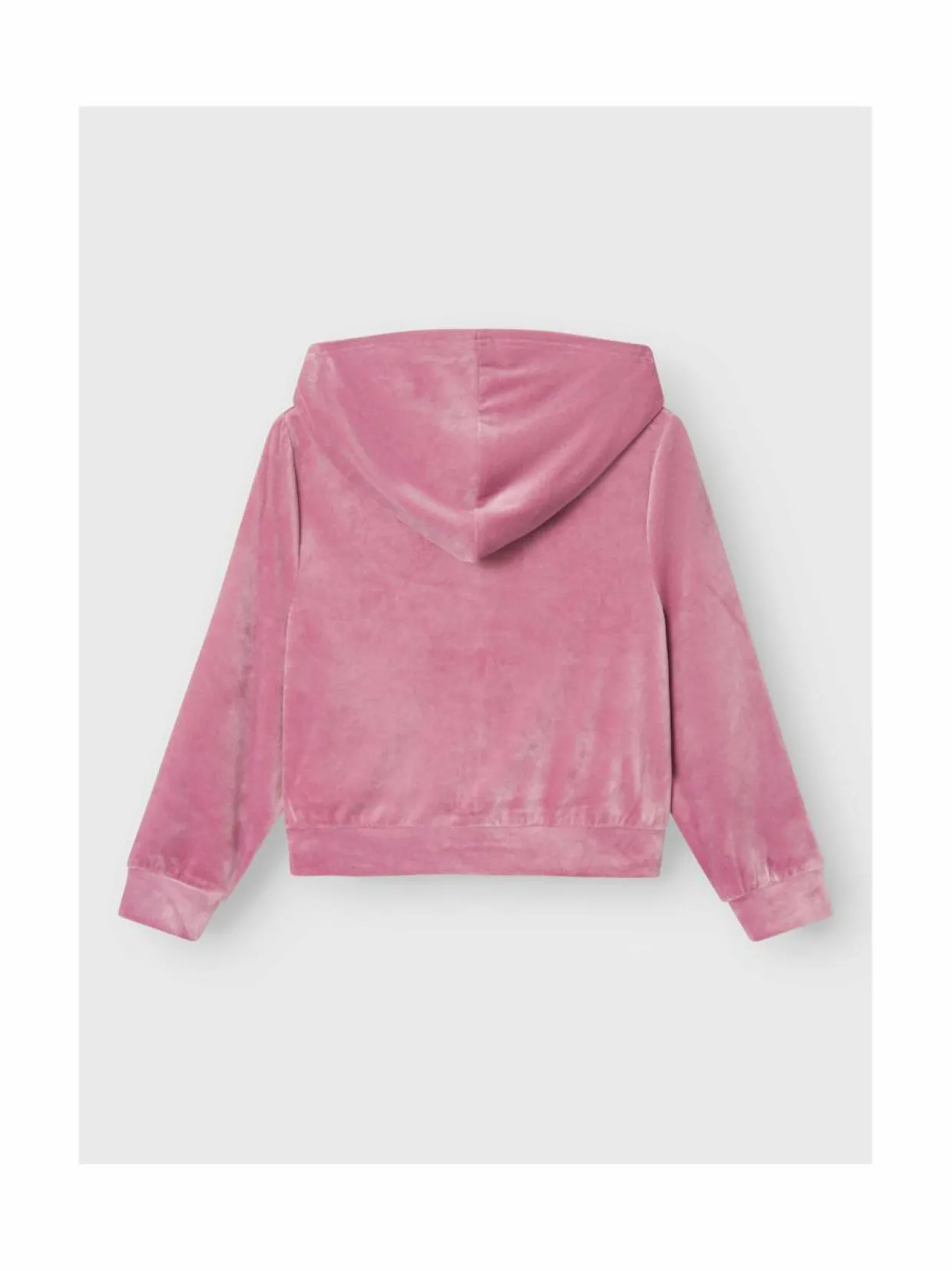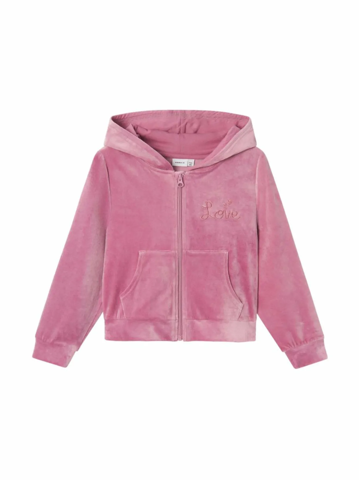 Lasten samettisen pehmeä hupparitakki tekstibrodeerauksella. Edessä on vetoketjusulku leukasuojalla sekä taskut. Samettihuppari on suunniteltu normaalilla istuvuudella.