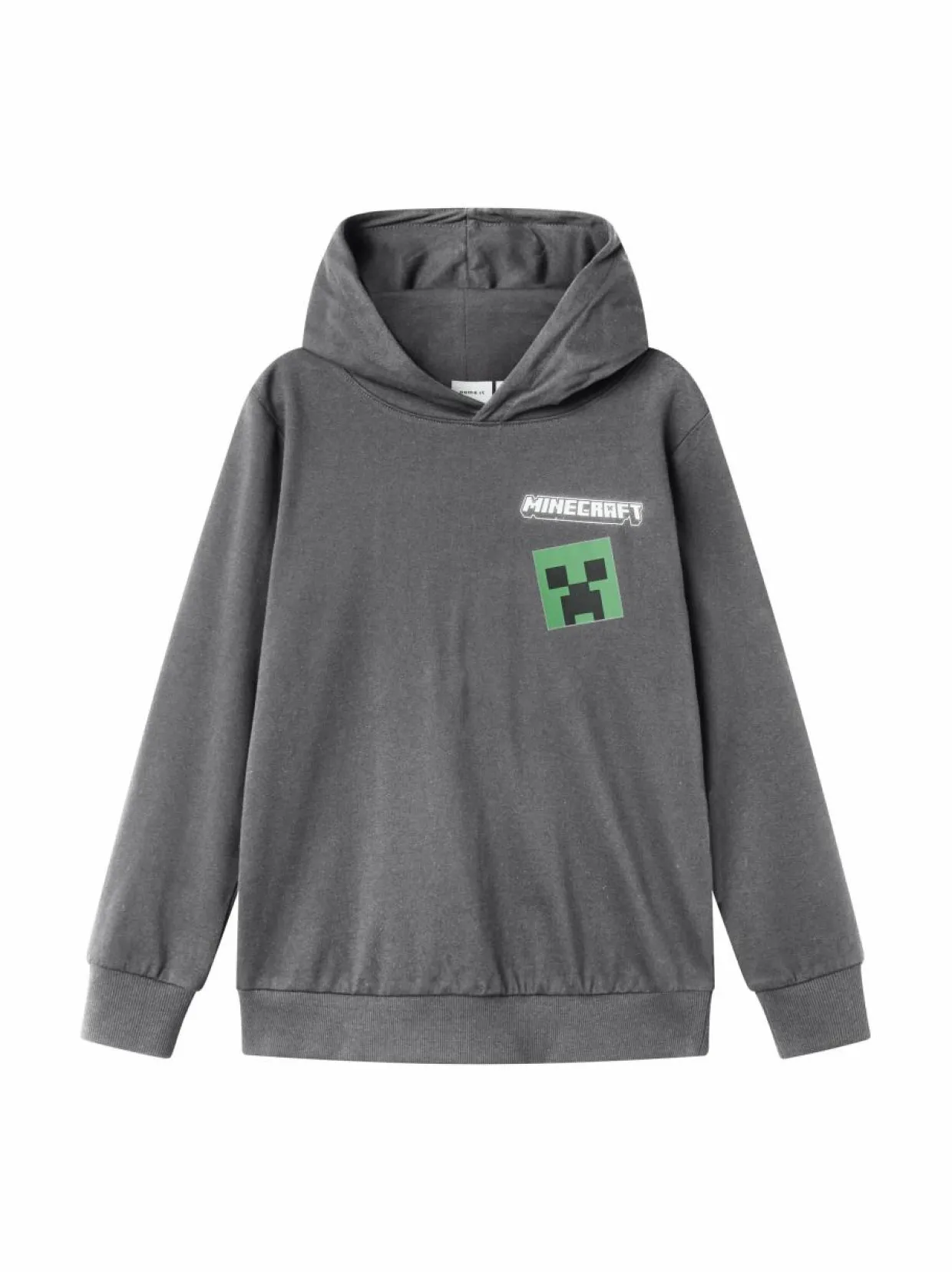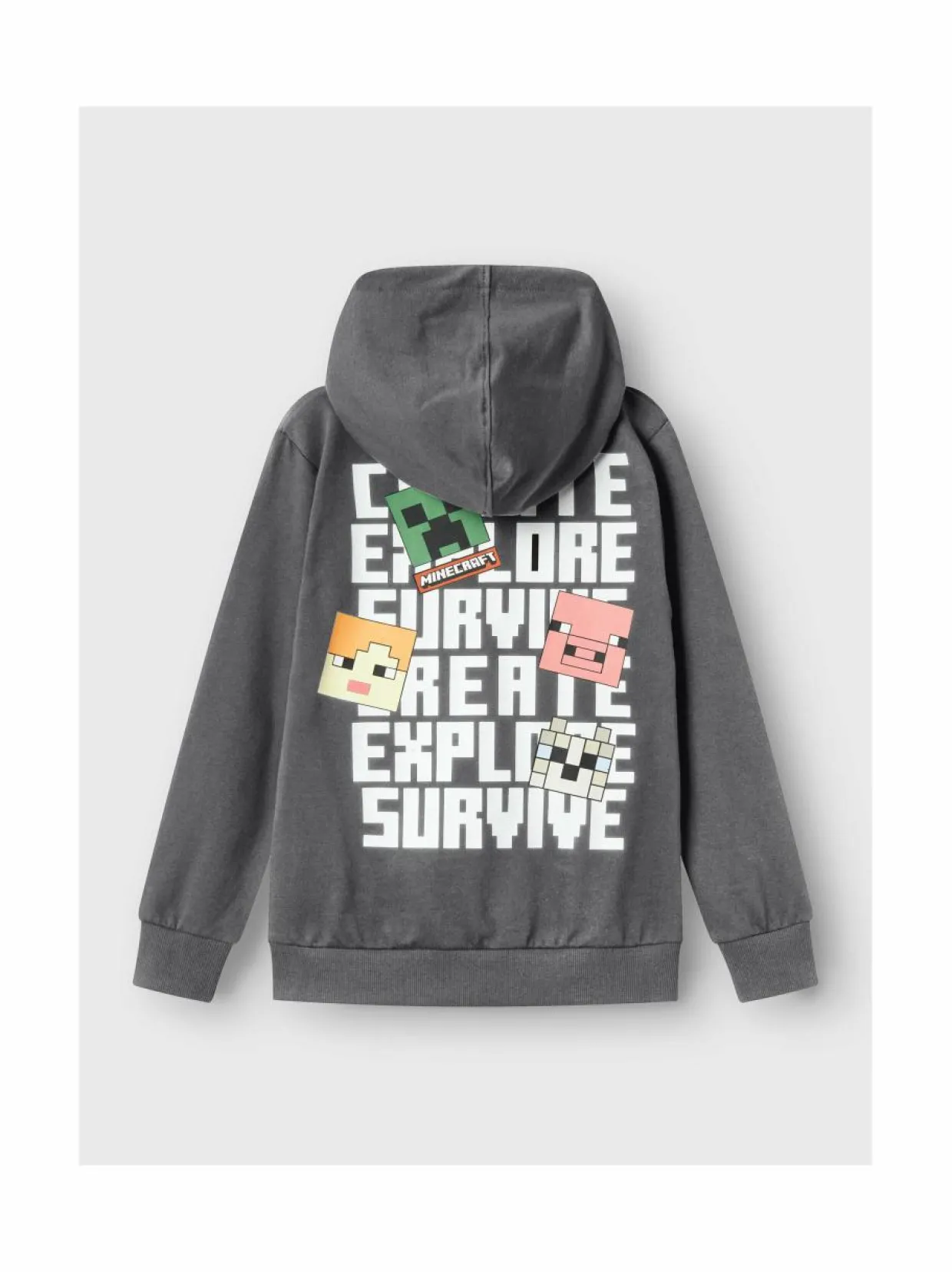 Name It -merkin huppari, jossa on Minecraft-aiheinen painatus edessä ja takana. Hupun etuosassa on vihreä Minecraft-hahmo ja takana teksti ”CREATE EXPLORE SURVIVE” sekä Minecraft-hahmoja. Huppari on valmistettu pehmeästä puuvillasta ja siinä on mukava istuvuus. Huppari on täydellinen valinta Minecraft-faneille.