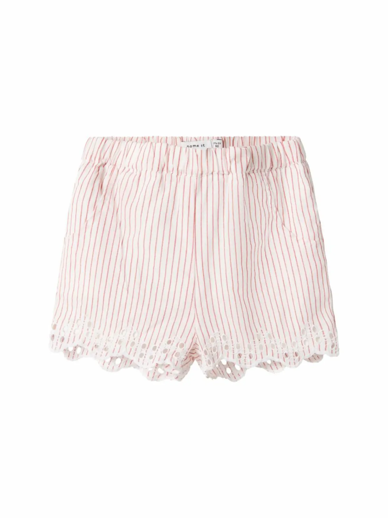 Nämä Name It -merkin shortsit ovat valmistettu pehmeästä puuvillasta. Shortsit ovat mukavat ja hengittävät, ja niissä on kaunis pitsi reunus. Shortsit ovat täydellinen valinta vaikka lämpimiin kesäpäiviin tai matkalle. Puuvilla on luonnollinen materiaali, joka on pehmeä ja hengittävä. Se on myös kestävä ja helppohoitoinen. Puuvilla on hyvä valinta vaatteille, joita käytetään paljon ja jotka altistuvat kulumiselle.
