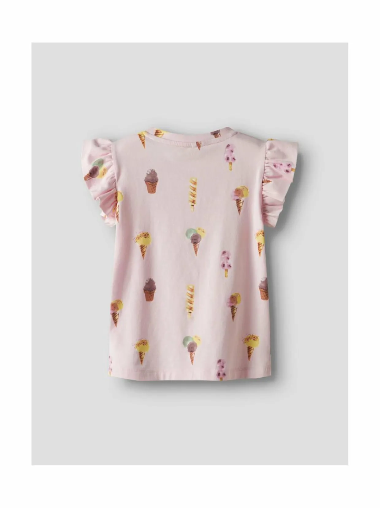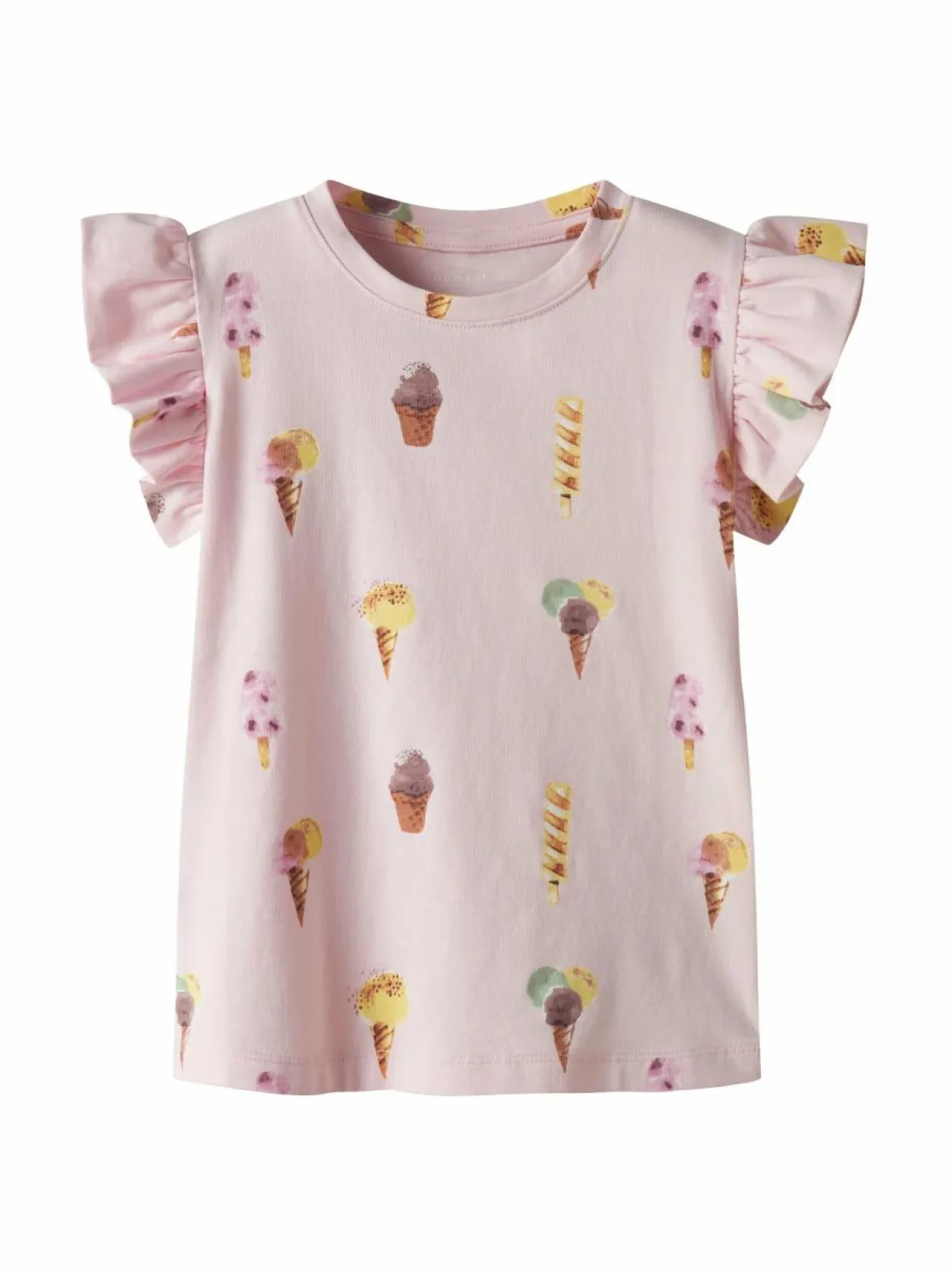 Mukava lyhythihainen t-paita aurinkoisiin kesäpäiviin. Paidassa on ihana jäätelökuosi ja frillahihat. Valmistettu pehmeästä ja hengittävästä luomupuuvillasta elastaanilla, joka lisää joustavuutta.