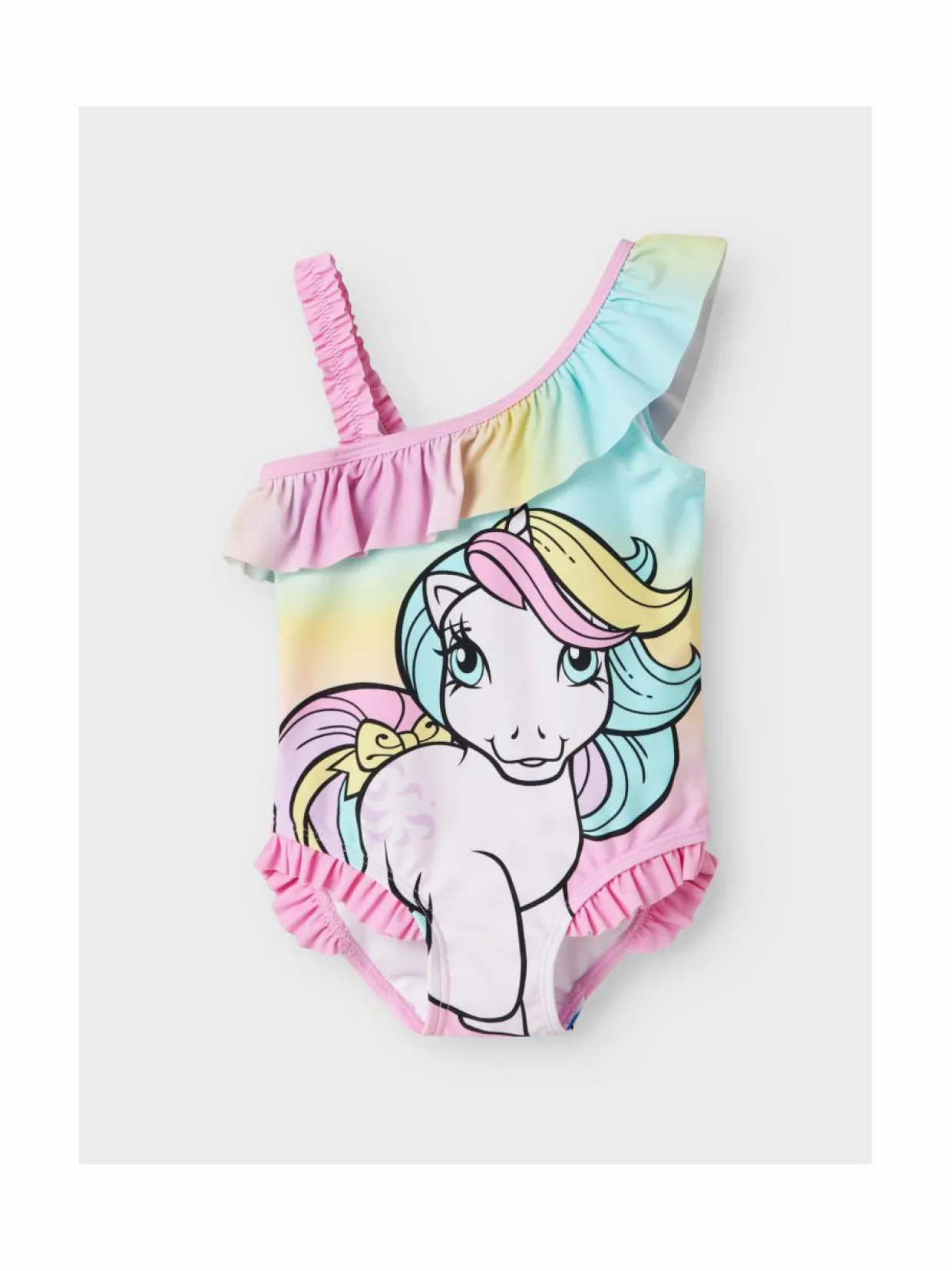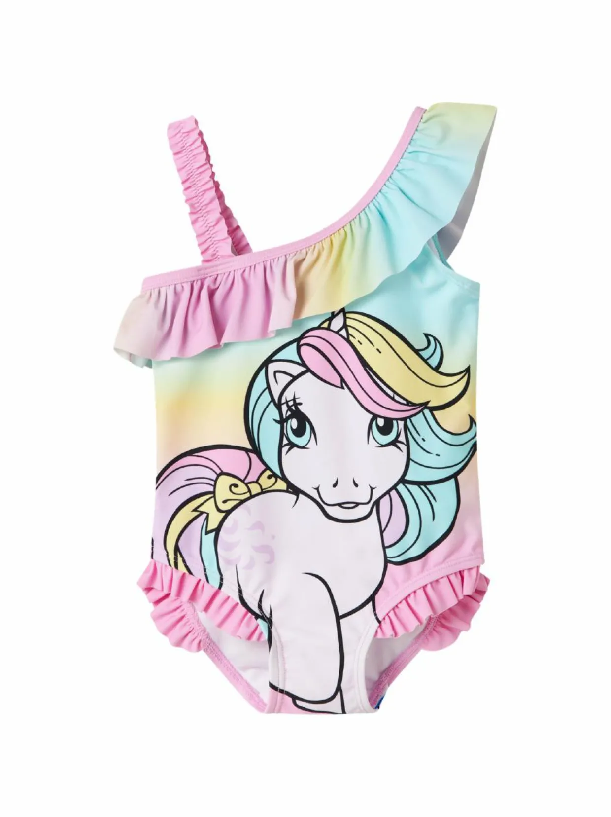 Ihastuttava, My Little Pony -kuviolla koristeltu uimapuku lapsille. Tämän sateenkaarensävyisen ja frillasomisteisen uimapuvun kangas on joustava sekä nopeasti kuivuva.