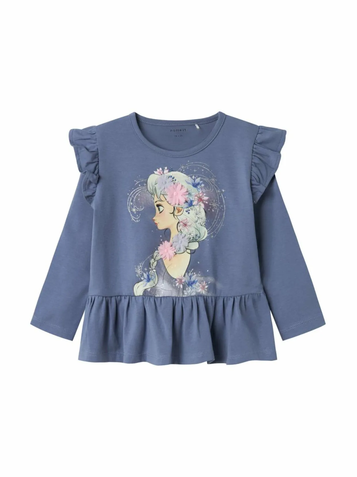 Name Itin NmfOkina Frozen -paita on valmistettu joustavasta puuvillatrikoosta. Paidan edustaa koristavat Frozen-printti ja 3D-kukat. Tyylin viimeistelevät röyhelöt helmassa ja olkasaumoissa.
