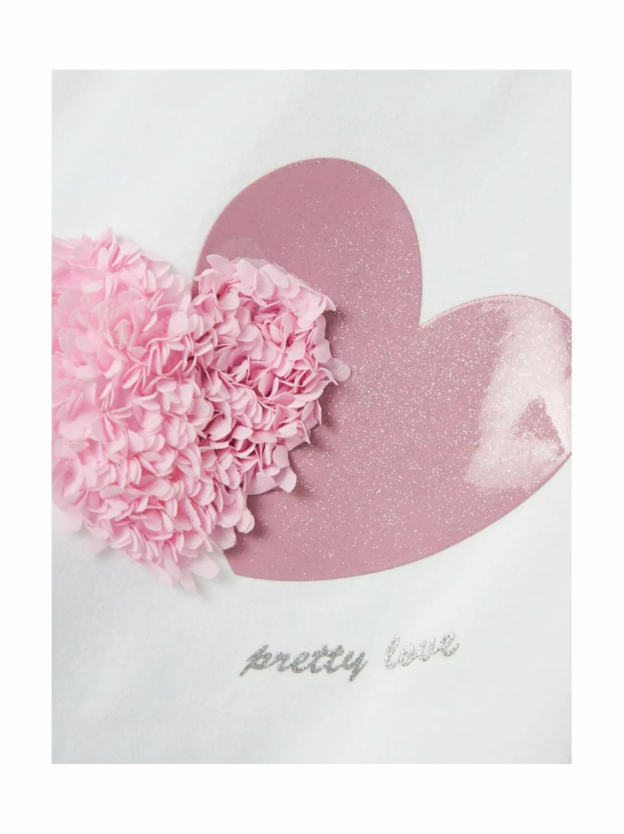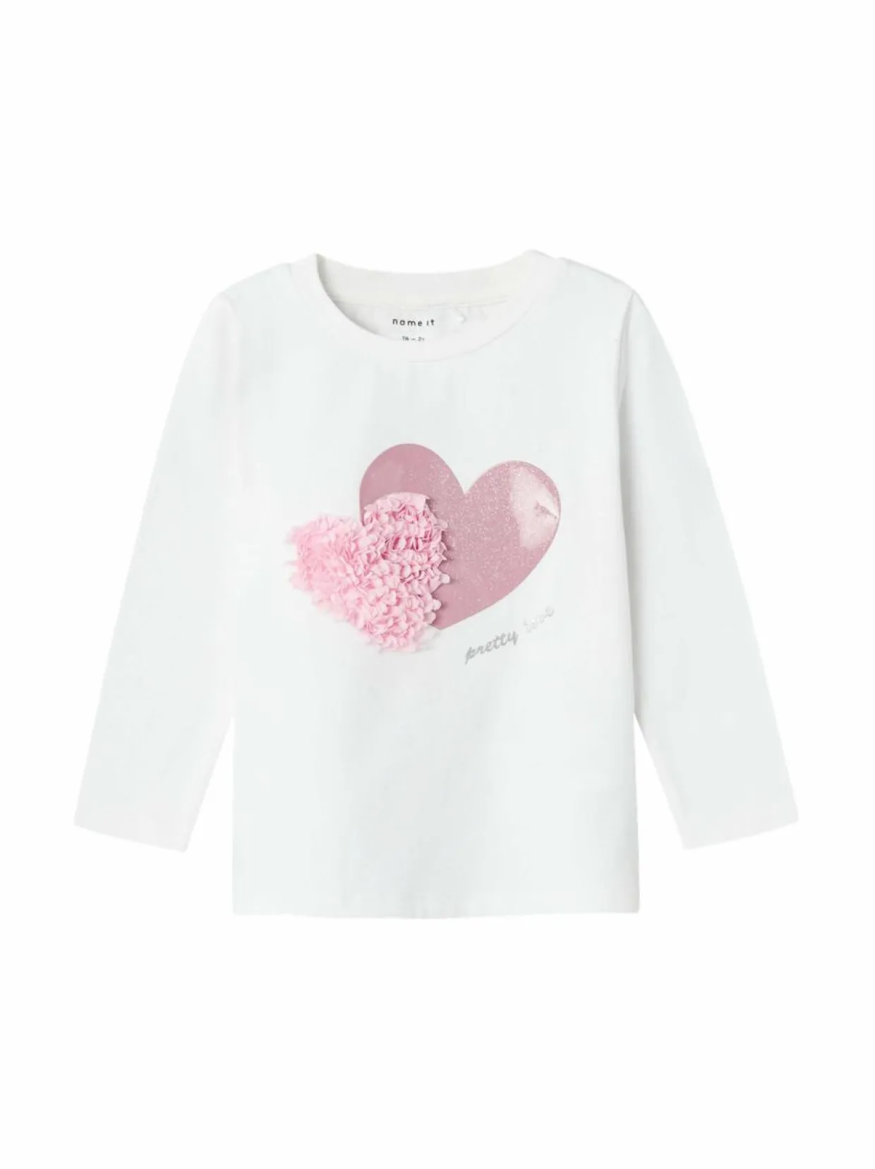 Name It:in NmfSarah-paidan edustaa koristaa hellyyttävä kuviointi, jota on täydennetty 3D-osilla. Pääntie on pyöreä ja resorillinen ja hihat ovat pitkät. Paidan materiaali on miellyttävää ja joustavaa trikoota, joka sisältää 95 % luomupuuvillaa.