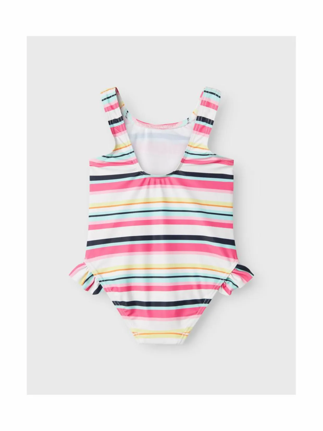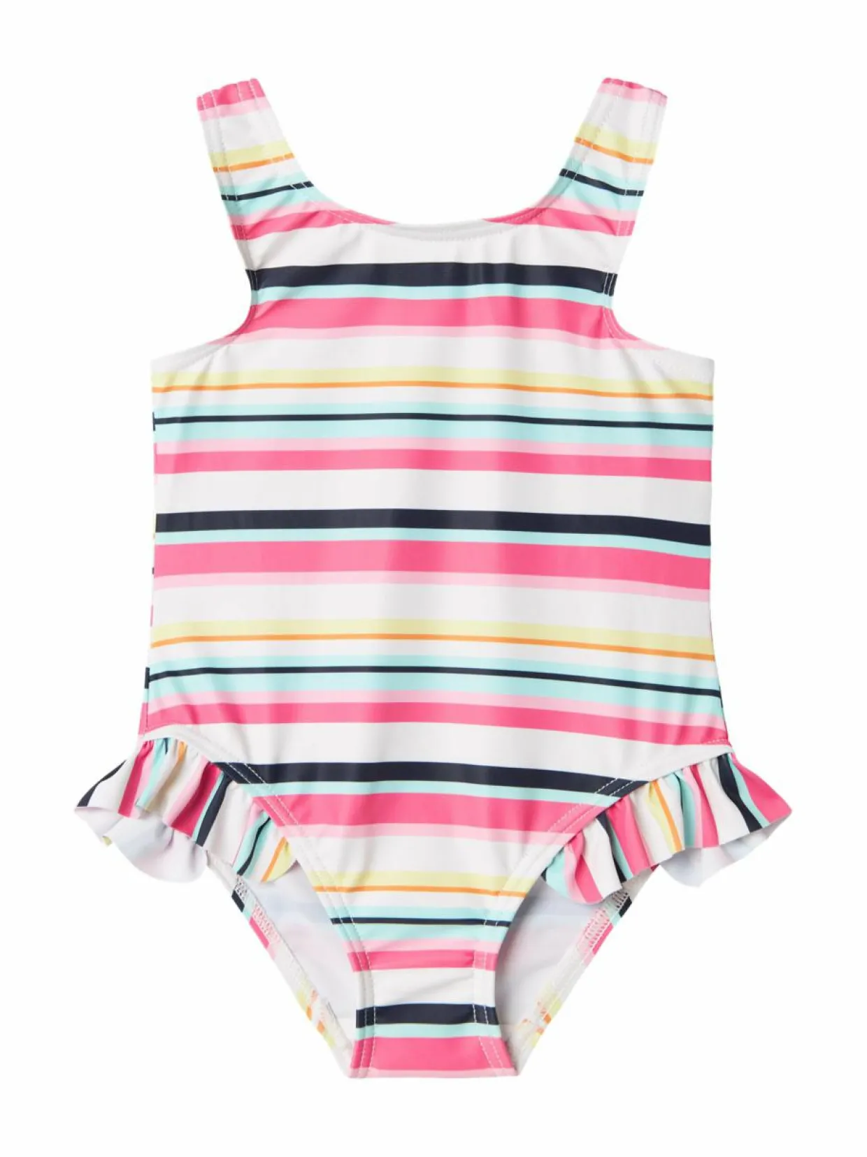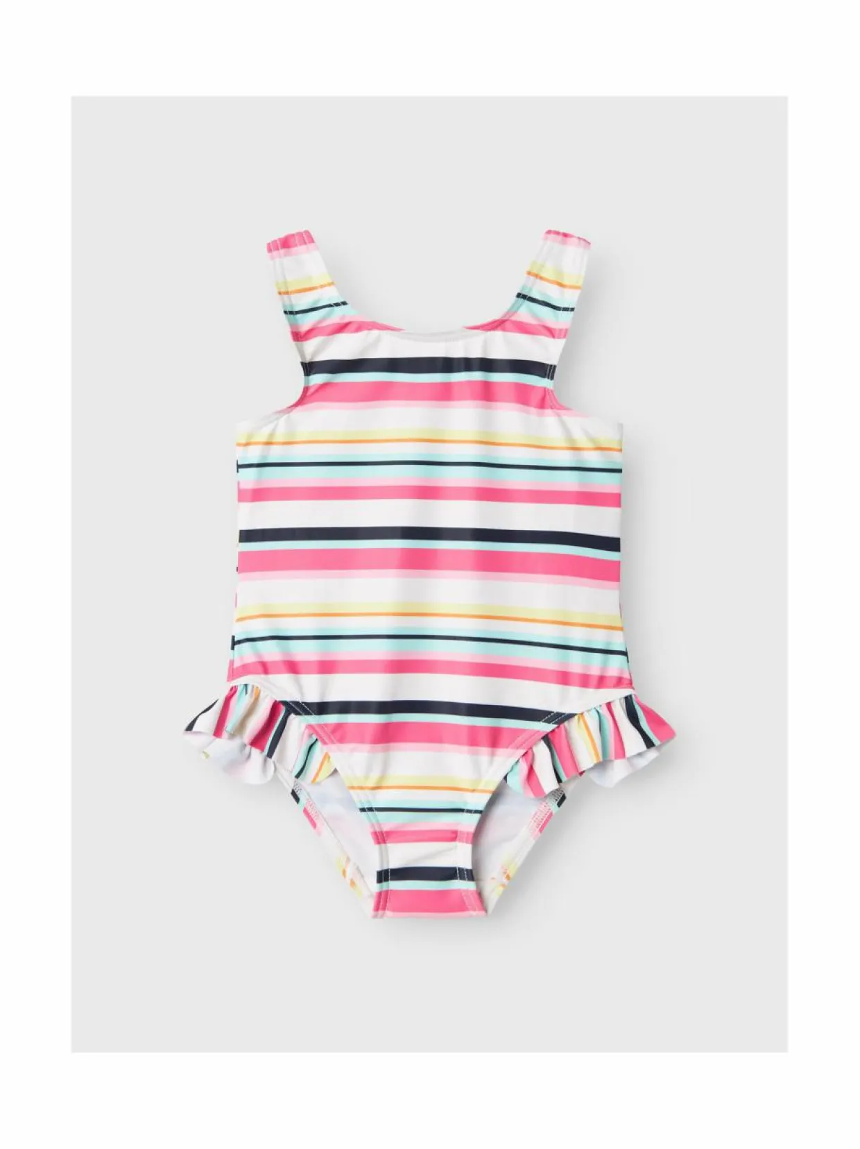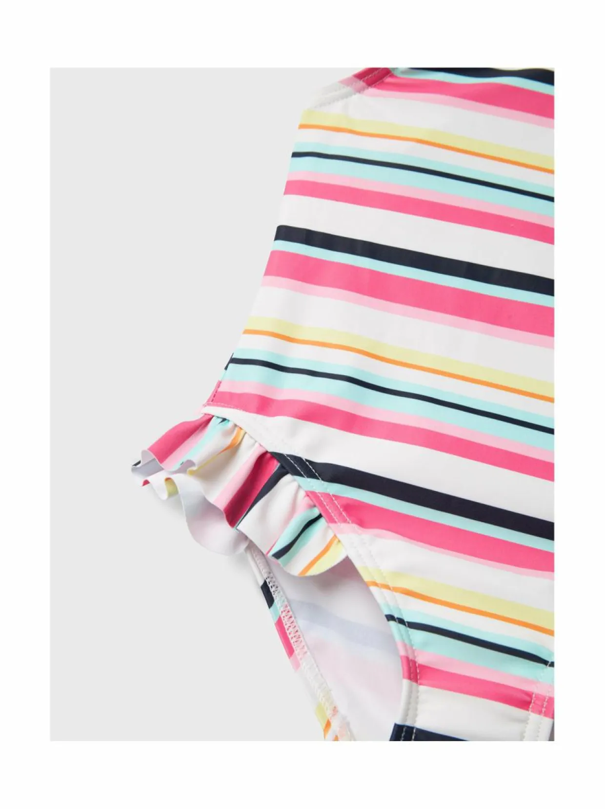 Lasten kuvioitu uimapuku on valmistettu pehmeästä ja joustavasta materiaalista. Uima-asu on varustettu leveillä olkaimilla ja röyhelöillä. Materiaali on kestävää kierrätettyä polyesteriä.