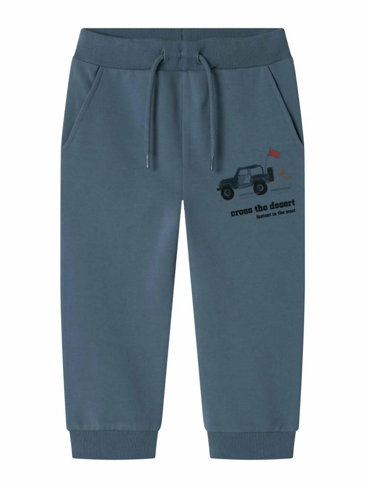 Klassiset collegehousut kokopeittävällä kuviolla. Name it housujen vyötärölinjassa on joustoa sekä säätömahdollisuus. Myös vyötärön sisäpuolella on säätömahdollisuus. Lahkeensuissa on joustavat resorit. Materiaalina pehmeä luomupuuvilla, joka sisältää myös elastaania joustavuutta varten.