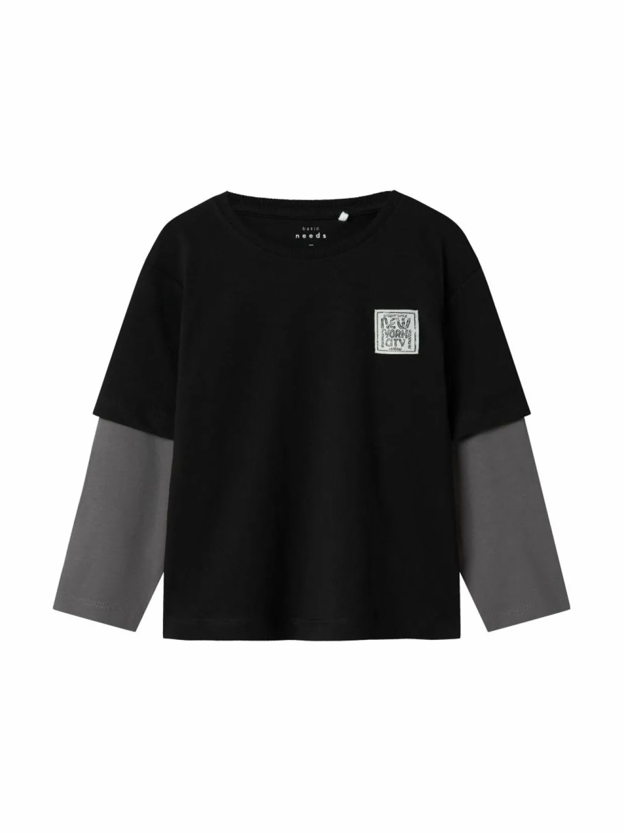 Lasten pitkähihainen paita luo kerrostetun ilmeen hihojen muotoilun ansiosta. Pääntiellä kulkee pehmeä resori. Edessä painatus. Tässä paitamallissa on suoralinjainen normaali istuvuus.