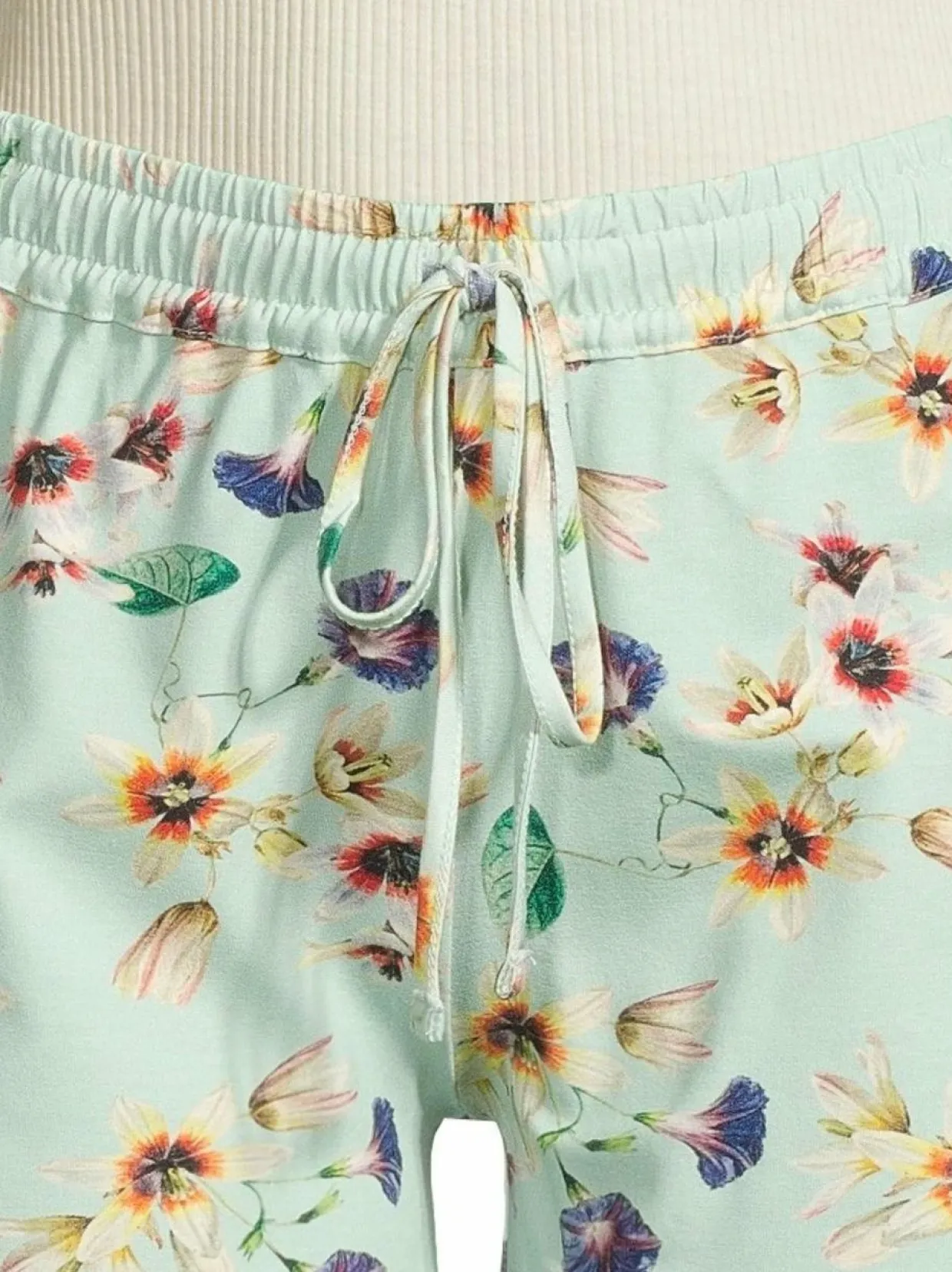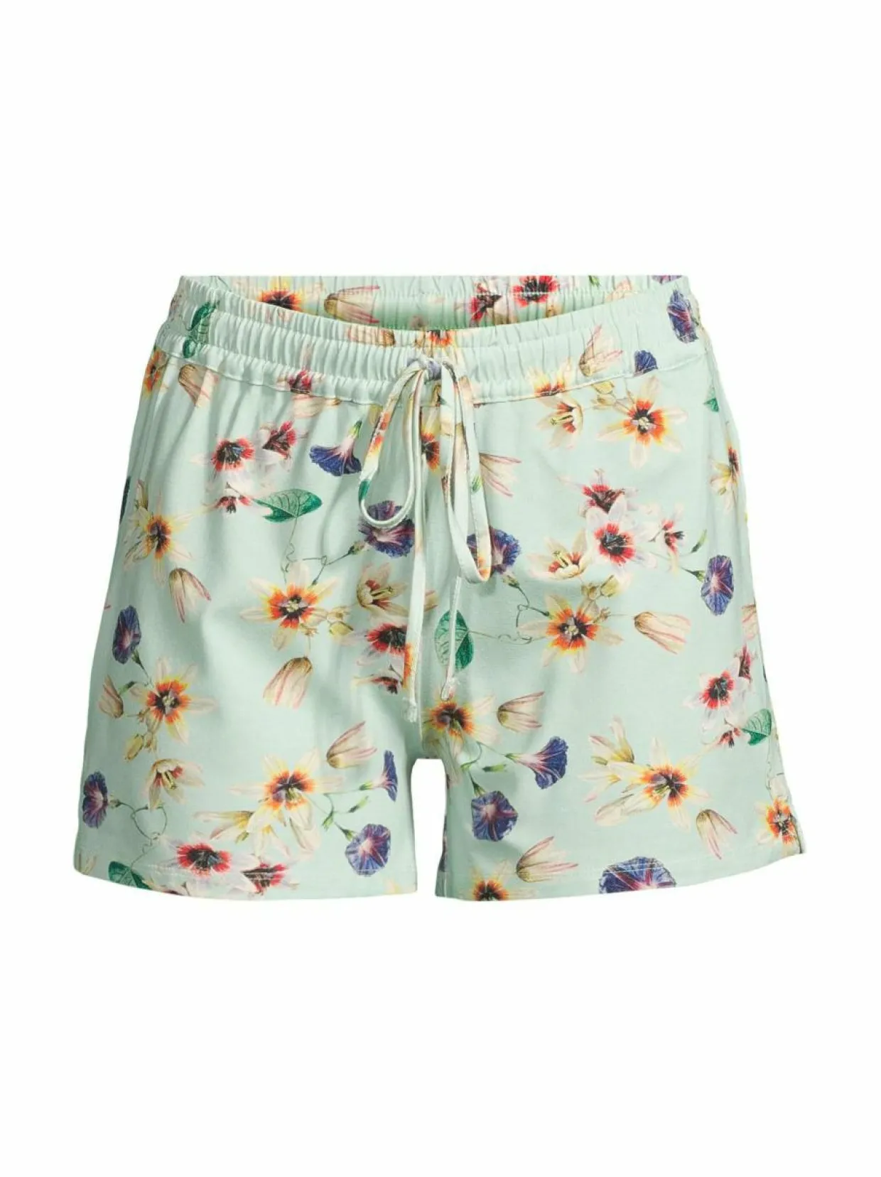 Essenza-merkin Nori Fiorre -pyjamashortsit ovat kukkakuvioidut, rennot ja mukavat. Shortsit ovat valmistettu pehmeästä viskoosi- ja elastaanisekoitteesta, joka hengittää ja tuntuu iholla miellyttävältä. Viskoosin ansiosta shortsit ovat pehmeät ja mukavat käyttää. Elastaani lisää joustavuutta ja tekee shortsit mukaviksi käyttää. Shortsit ovat vyötäröltä joustavat ja niissä on säädettävä nyöri vyötäröllä.