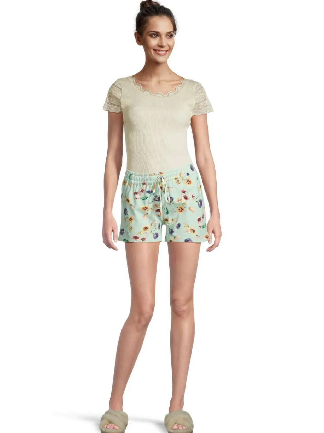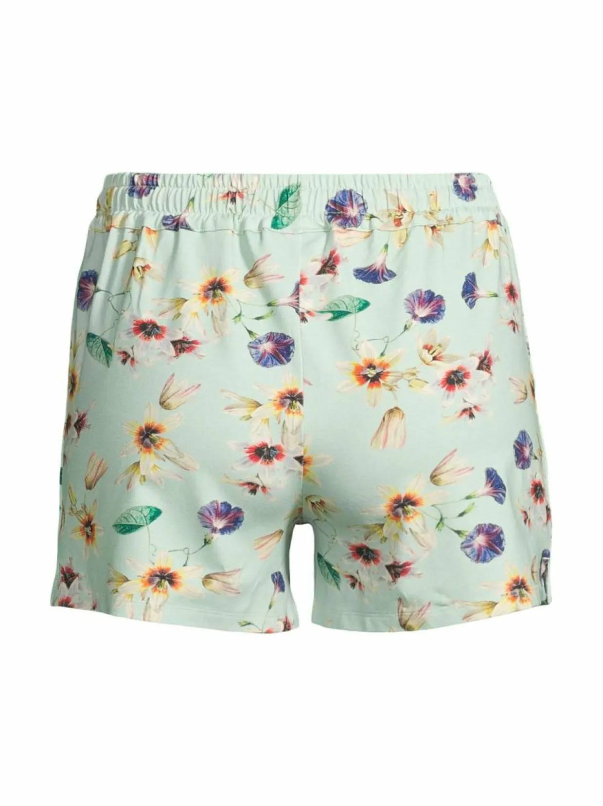 Materiaali96 % viskoosi, 4 % elastaani Hoito-ohjeetPesu 30 asteessa, rumpukuivaus kielletty, silitys kielletty. Pesulämpötila30 °C ValmistusmaaTurkki VäriSUBTLE GREEN Avainsanatshortsit, yöasu, oloasu, Essenza, kukkakuvio, viskoosi, pyjamashortsit, yöshortsit