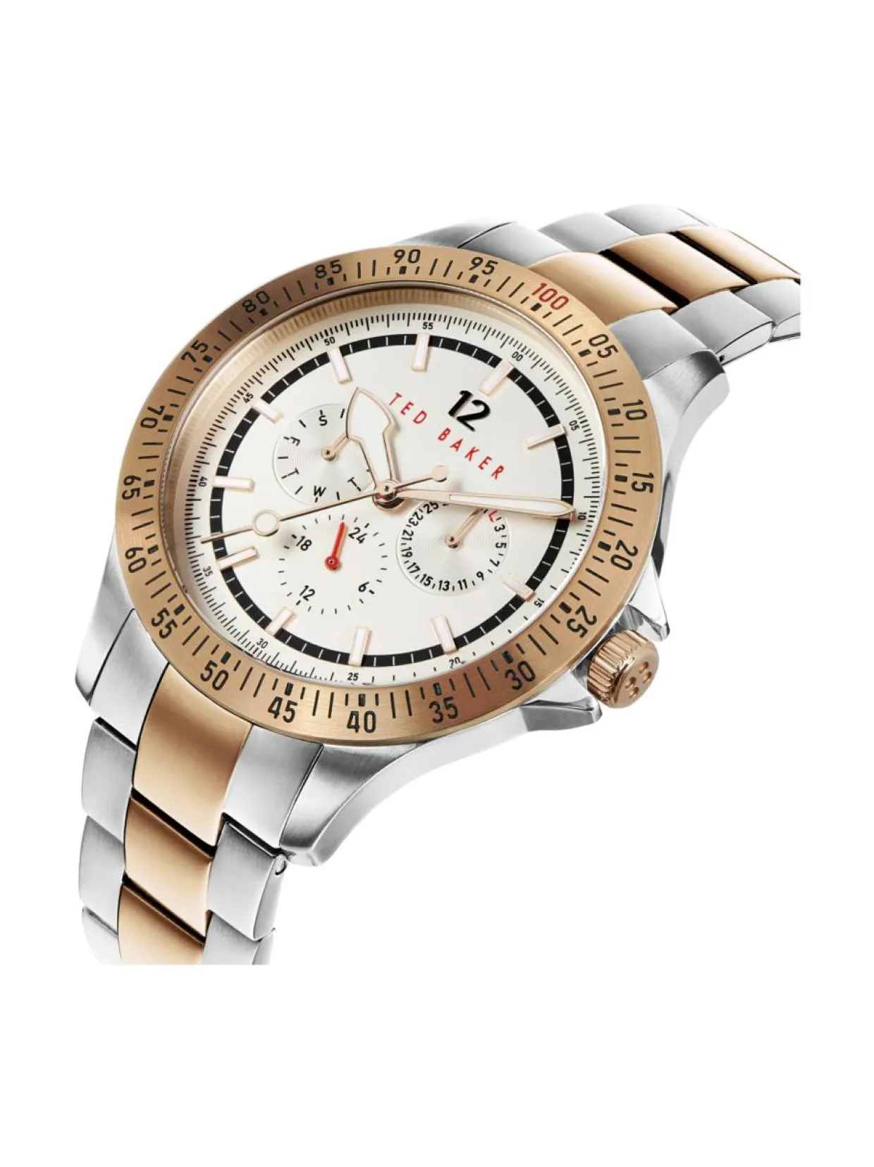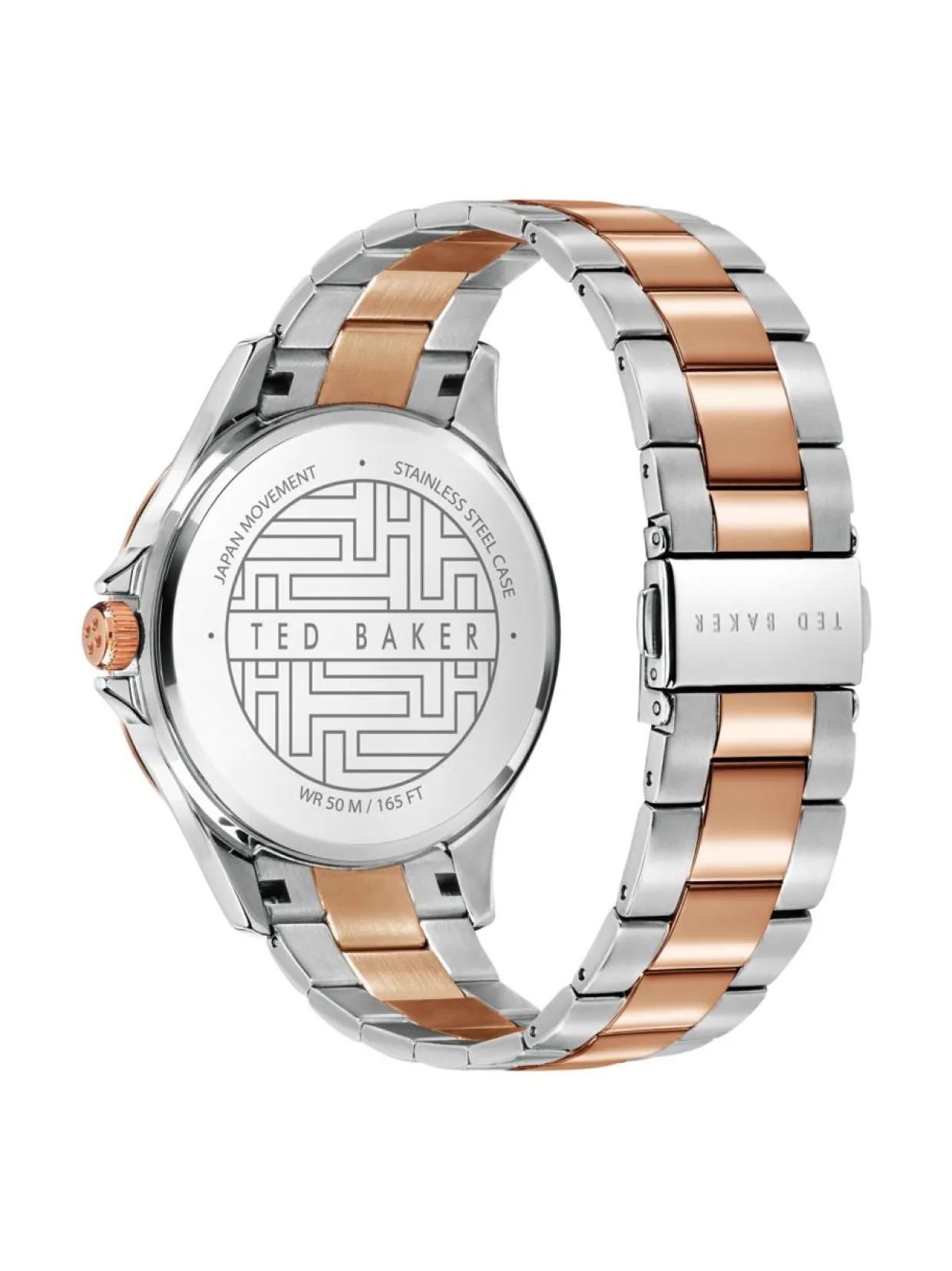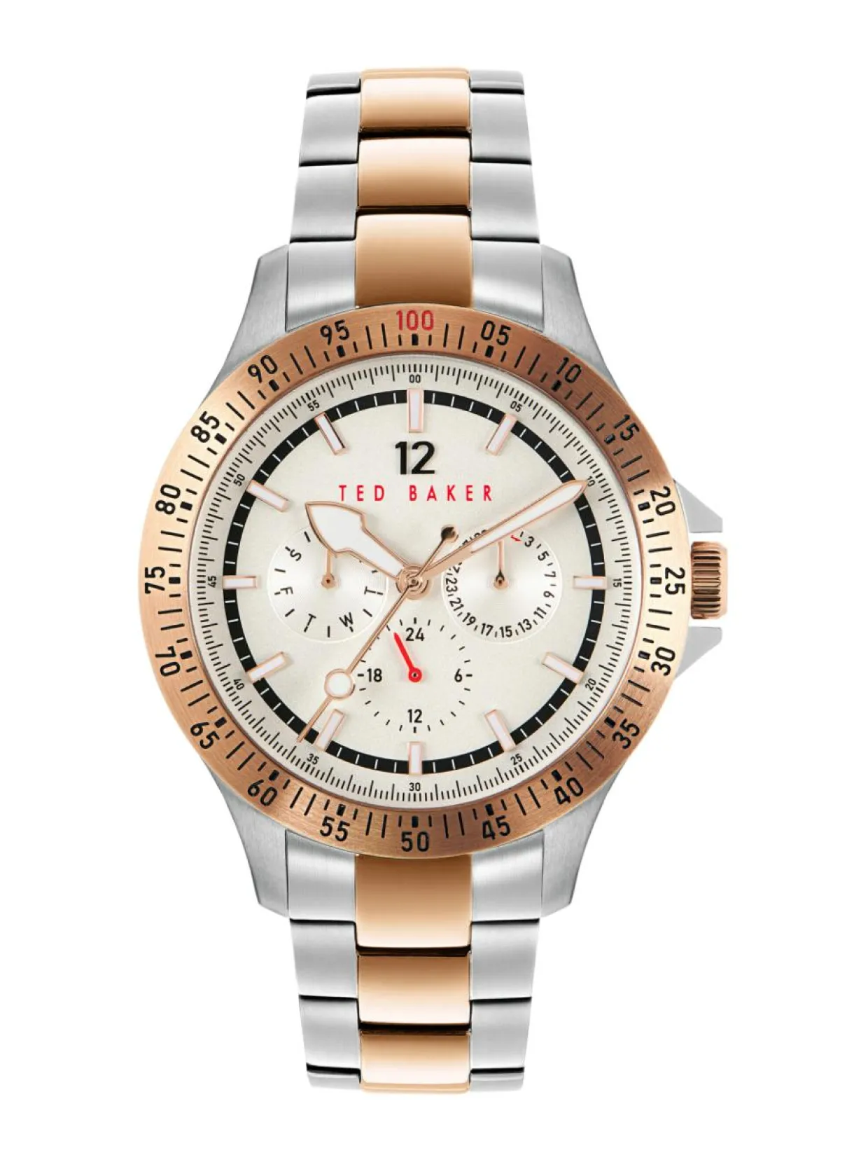 Ted Baker Northan 43mm rannekello on varma valinta kun haluat näyttävän sporttisen näköisen kellon. Kellon hopeanvärinen runko on valmistettu ruostumattomasta teräksestä. Sen leveys on 43 mm ja paksuus on 9 mm. Kellon kehä on ruusukullanvärinen ja se on ruostumatonta terästä. Rannekkeena tässä mallissa on kullan- ja hopeanvärinen metalliranneke, joka on valmistettu ruostumattomasta teräksestä. Valkoisessa kellotaulussa on 24 tunnin näyttö sekä pienemmät näytöt viikonpäiville ja päivämäärille. Kellossa on mineraalilasi ja kvartsikoneisto. Kellon vesitiiviys on 5ATM. Ted Baker kelloilla on 2 vuoden takuu.