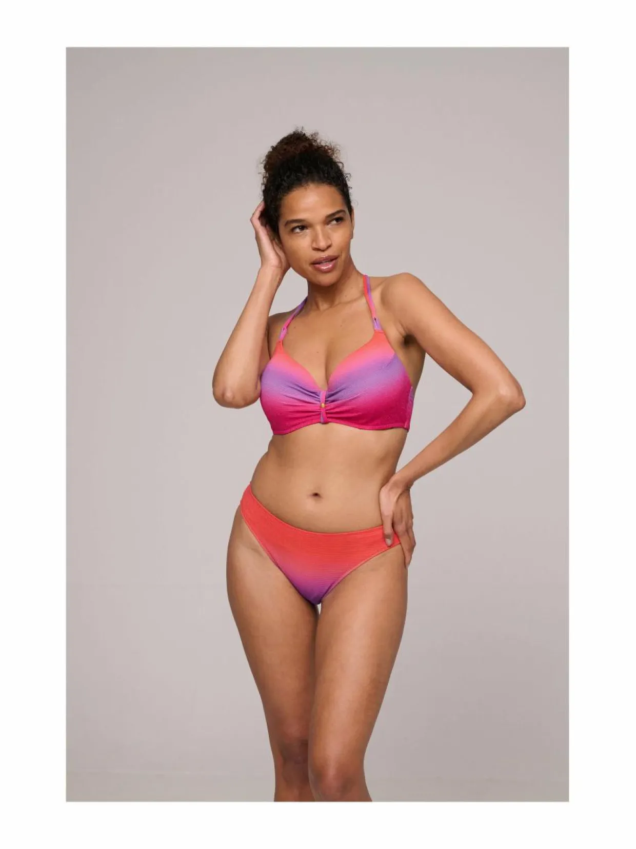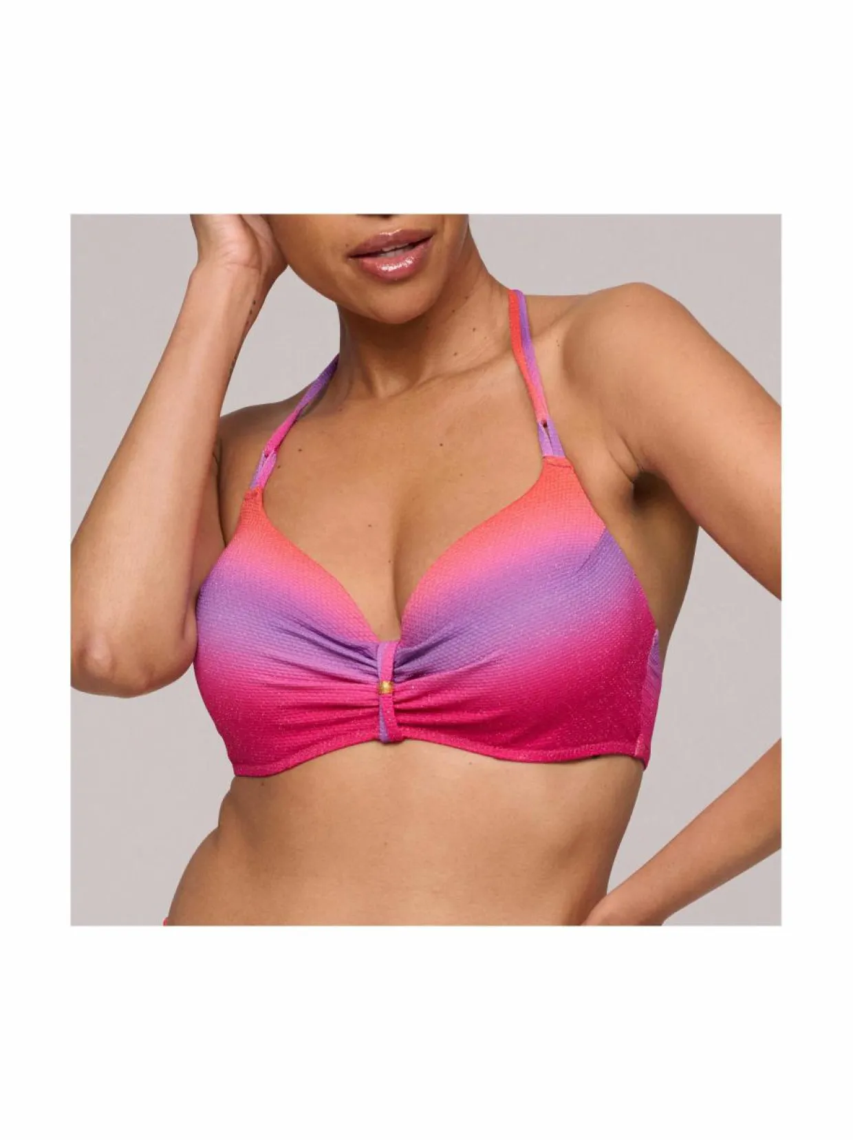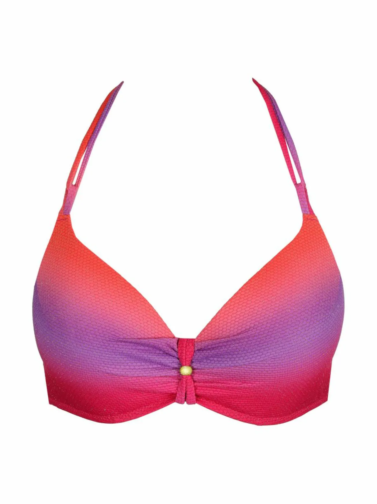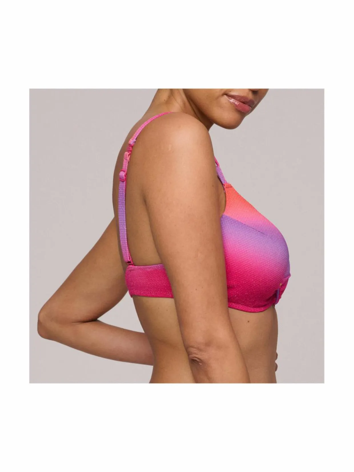 Marie Jo merkkinen kaarituellinen ja pehmustettu Nusa Dua -bikinitoppi tarjoaa hyvän tuen rinnoille. Säädettäviä olkaimia voi käyttää joko kaulan takana tai perinteisesti olkapäillä. Hennosti kiiltävä värikäs kangas on miellyttävän joustava ja nopeasti kuivuva.