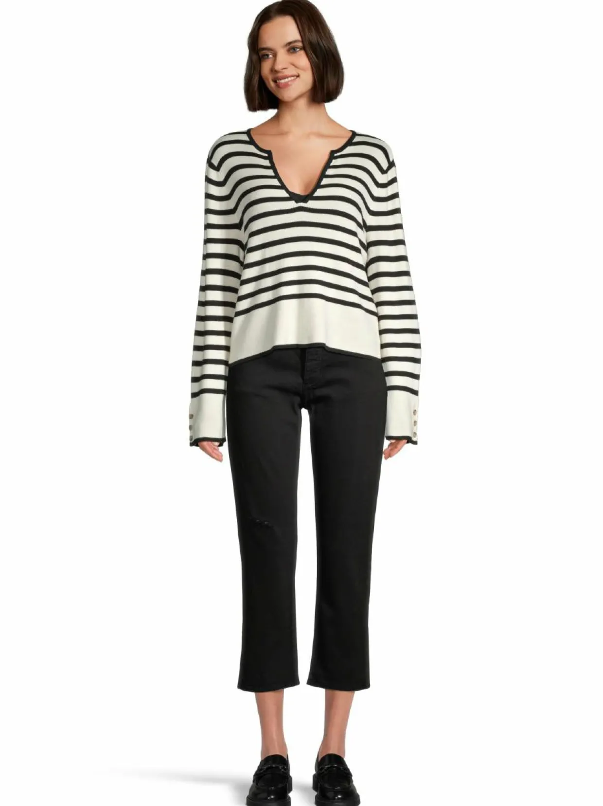 Materiaali90 % viskoosi, 10 % polyamidi Hoito-ohjeetPestävä samansävyisten kanssa VäriSANDSHELL STRIPES:BLACK AvainsanatObject, neulepusero, pusero, raitaneule, ecovero viskoosi