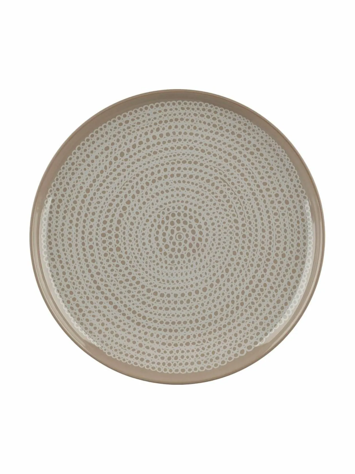 Ruskeasta kivitavarasta valmistetussa Oiva-lautasessa on hieman läpikuultava Räsymatto-kuosi.