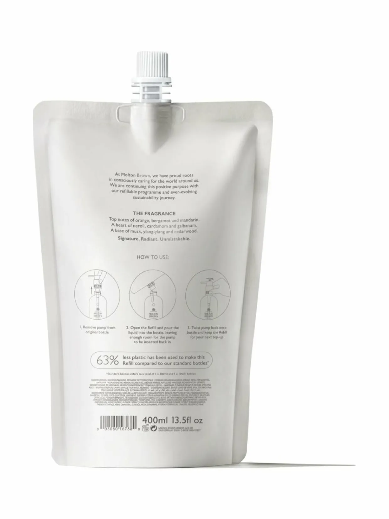 Sisältää raikkaan appelsiinin, kukkivan nerolin ja viipyvän myskin eloisia ja virkistäviä nuotteja. Käytä yhdessä yhteensopivan Molton Brown -käsiemulsion kanssa vahvistaaksesi eloisaa sitrustuoksua. Uudelleentäyttöpakkaus sisältää 63 % vähemmän muovia kuin tavalliset Molton Brown -pullot.- vastuullisempi tuote, joka vähentää jätettä