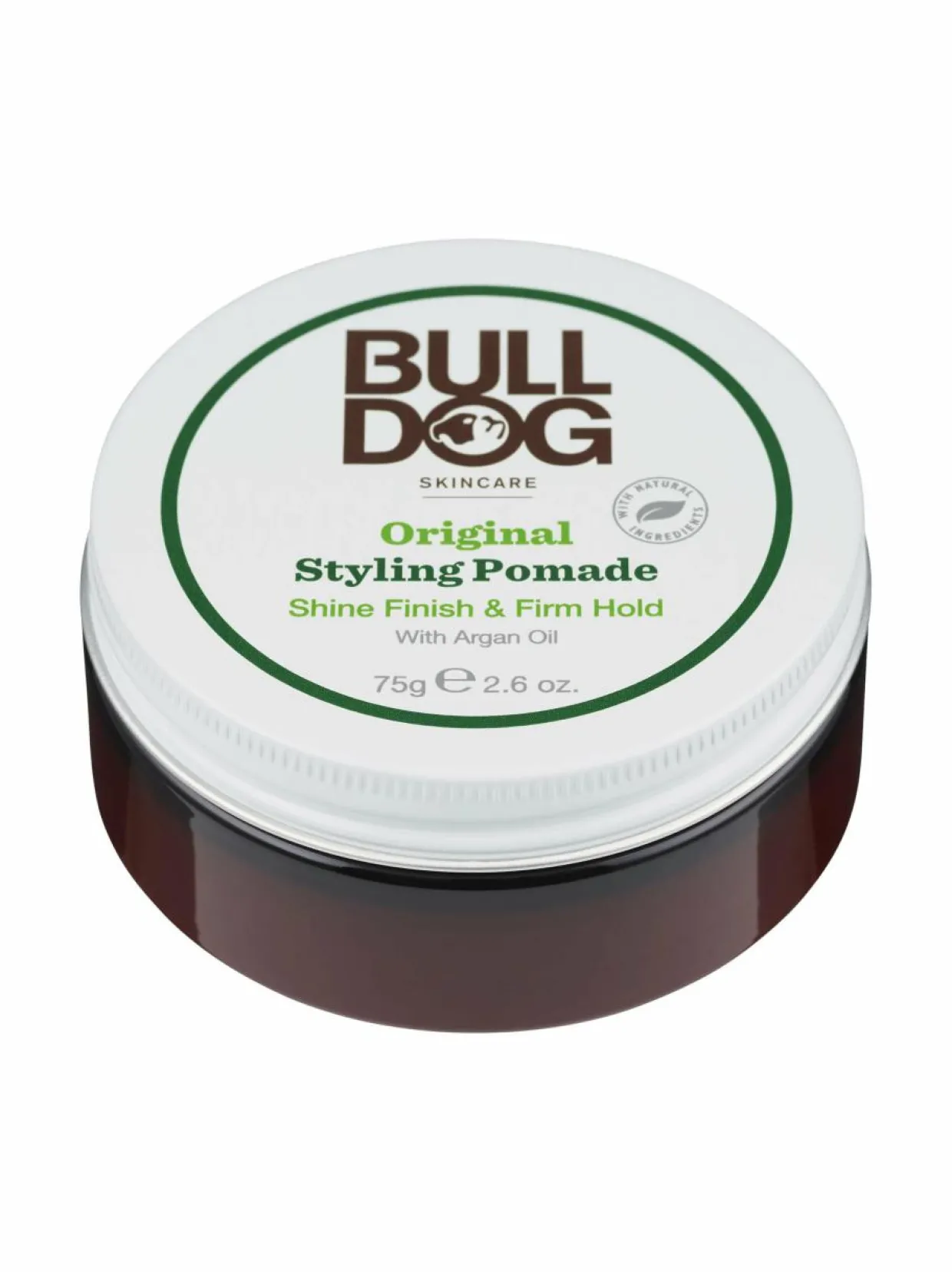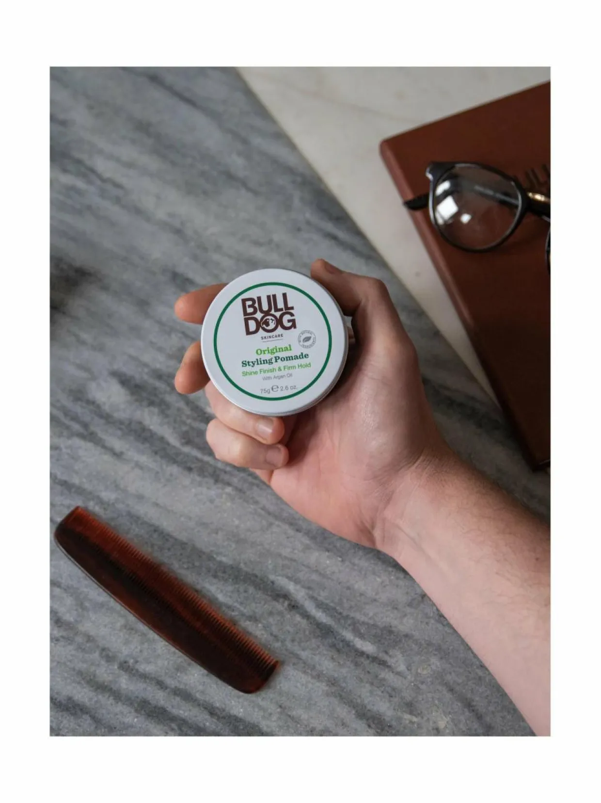 Bulldog Original Styling Pomade sopii kaikille hiustyypeille ja antaa luonnollista kiiltoa sekä voimakkaan pidon. Tuote on vegaaninen, 92,5 % sisällöstä on luonnollista alkuperää, muun muassa luonnolliset muotoiluaineet kandelilla- ja karnaubavaha. Pomada sisältää myös vastuullisesti tuotettua ja täysin jäljitettävissä olevaa argaaniöljyä, joka antaa luonnollisen kiillon ja pehmeyden vaikeasti käsiteltäviin hiuksiin.