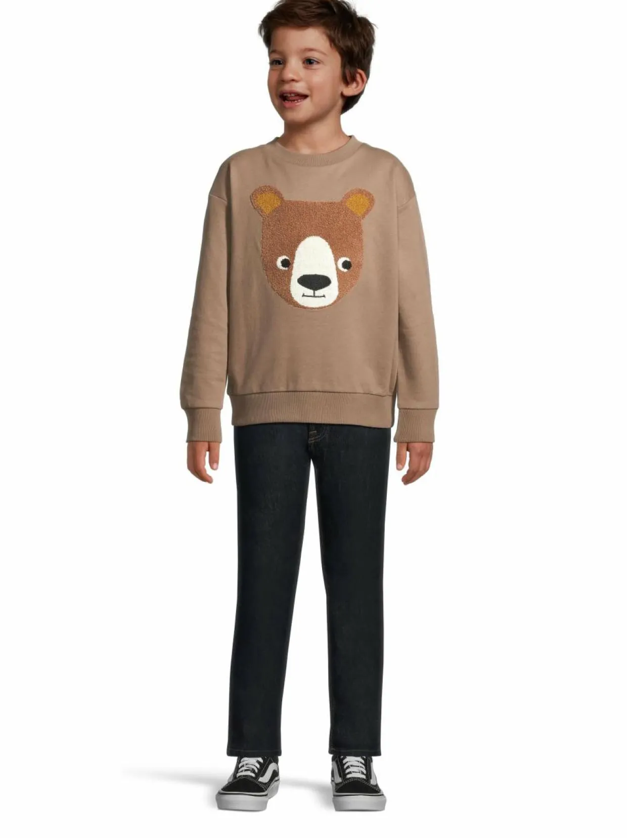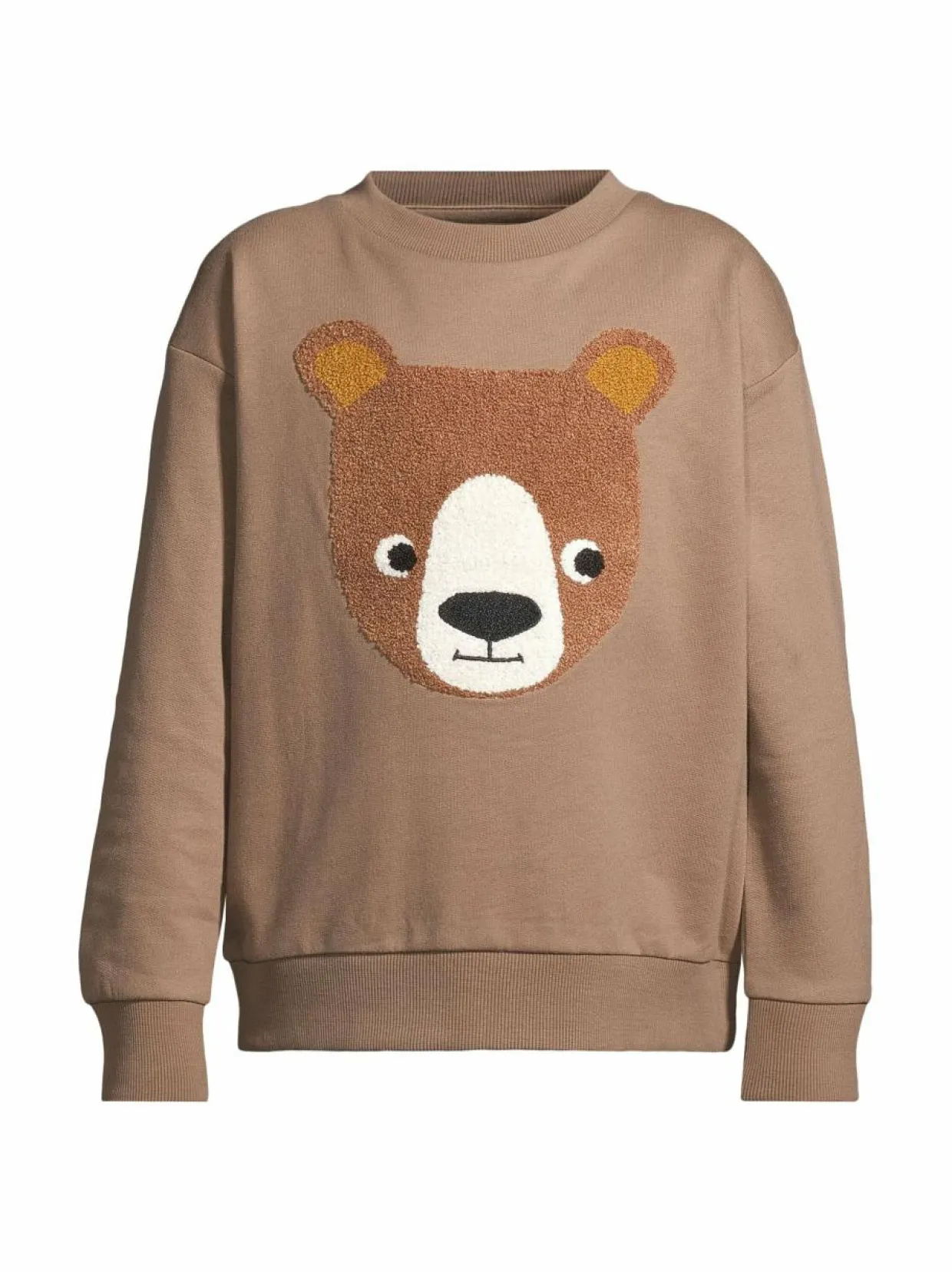 Lasten collegepaita pörröisellä karhuhahmolla. Joustoresorit kulkevat pääntiellä, helmassa ja hihansuissa. Sisäpuoli on pehmeäksi harjattua fleeceä. Materiaalina on käytetty ihoystävällistä luomupuuvillaa.