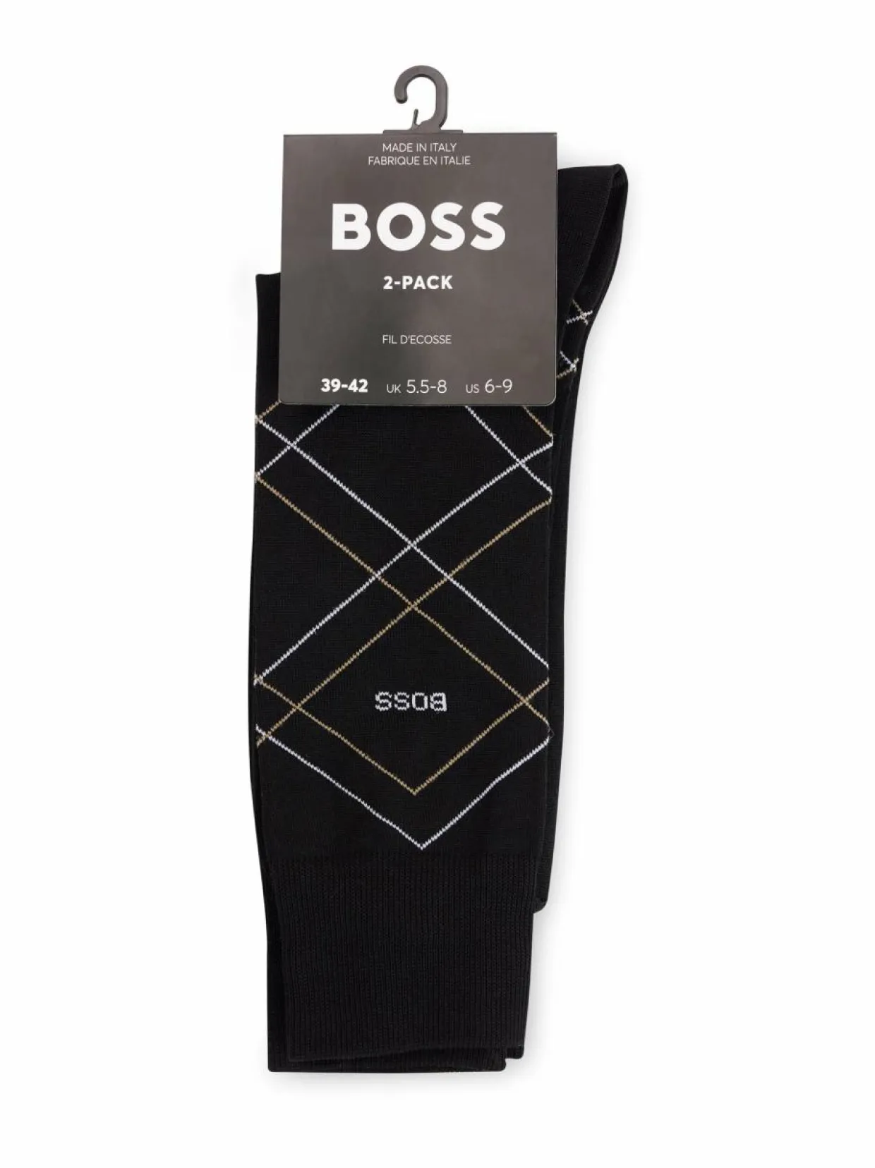 Boss Overcheck -ruutukuosiset sukat ovat miellyttävän tuntuista merseroitua puuvilla-polyamidia, johon elastaani lisää joustavuutta. Varresta löytyvät kiristämätön resori sekä logomerkki. Pakkaus sisältää kaksi paria sukkia. Vakiopituus 30 cm.