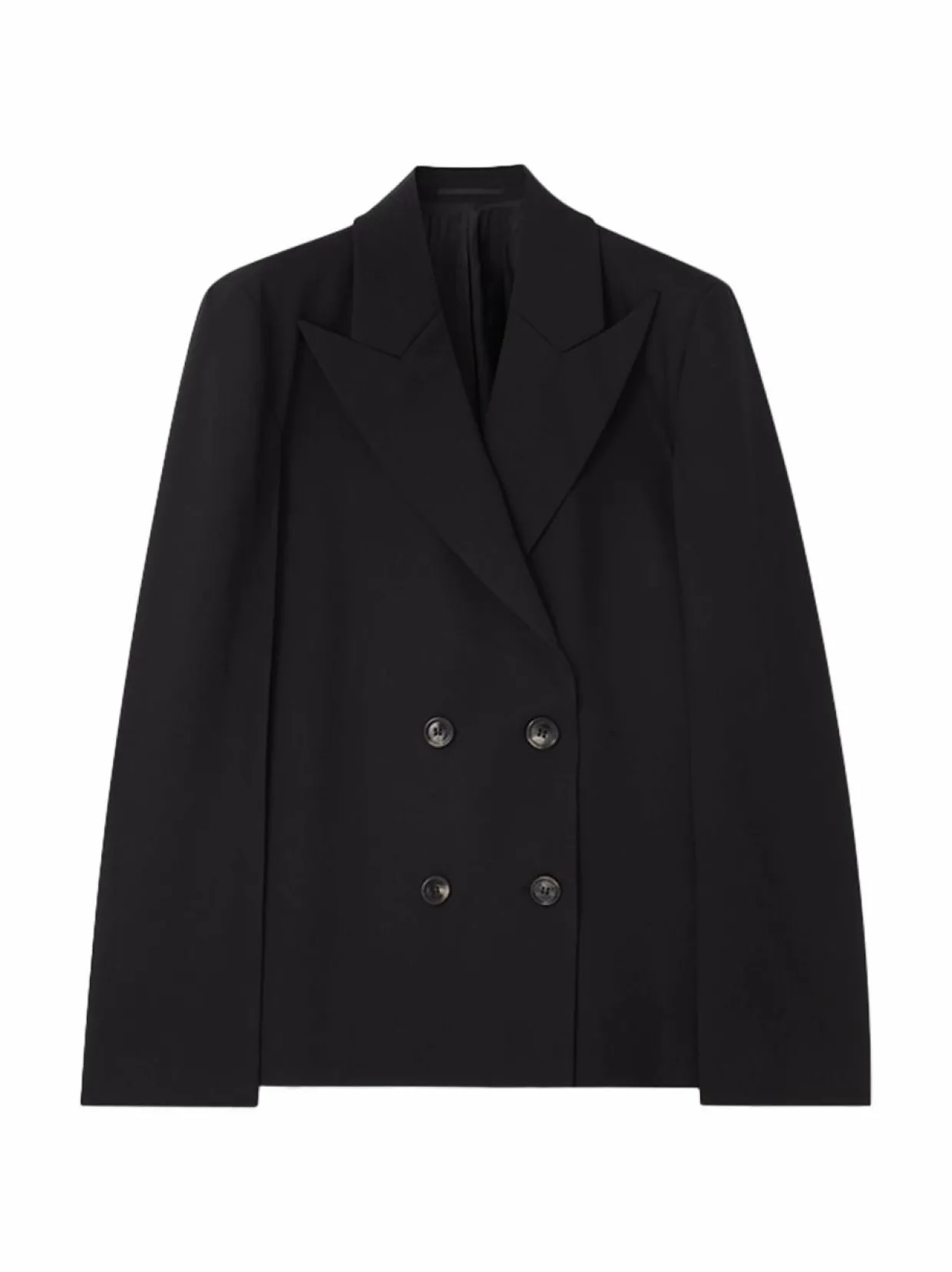 Ajaton ja minimalistinen bleiseri on valmistettu laadukkaasta gabardiinivillakankaasta. Bleiseritakissa madalletut olkapäät, edessä kaksirivinen nappikiinnitys sekä halkio takana ja taskut sivuilla. Takki on vuorattu.