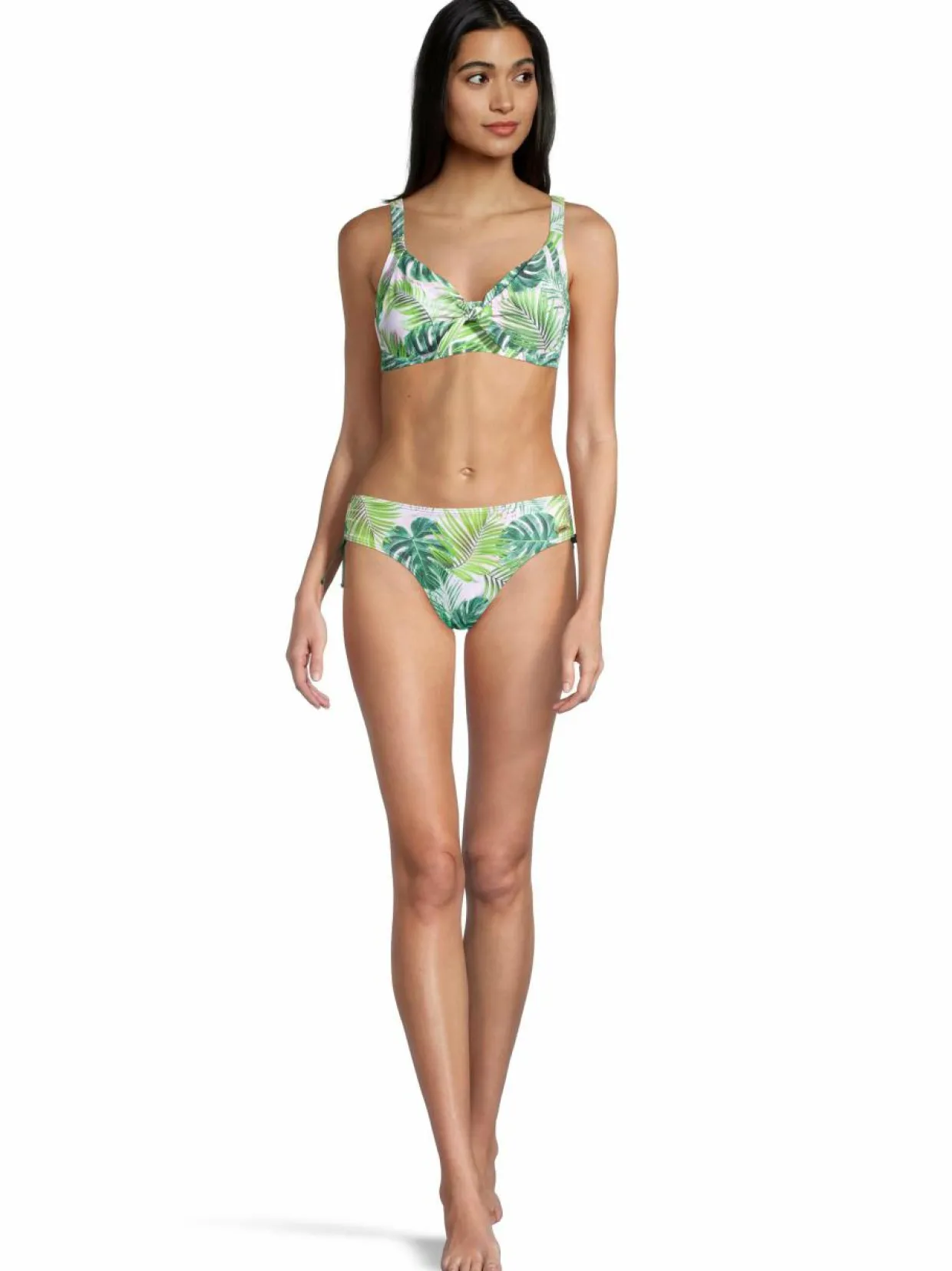 Damellan eksoottinen Palm Beach -bikiniyläosa tarjoaa mukavan tuen. Materiaali on joustava ja nopeasti kuivuva. Leveät ja säädettävät olkaimet lisäävät käyttömukavuutta. Kupit ovat kaarituelliset. Kuppien keskellä on kaunis rusetti.