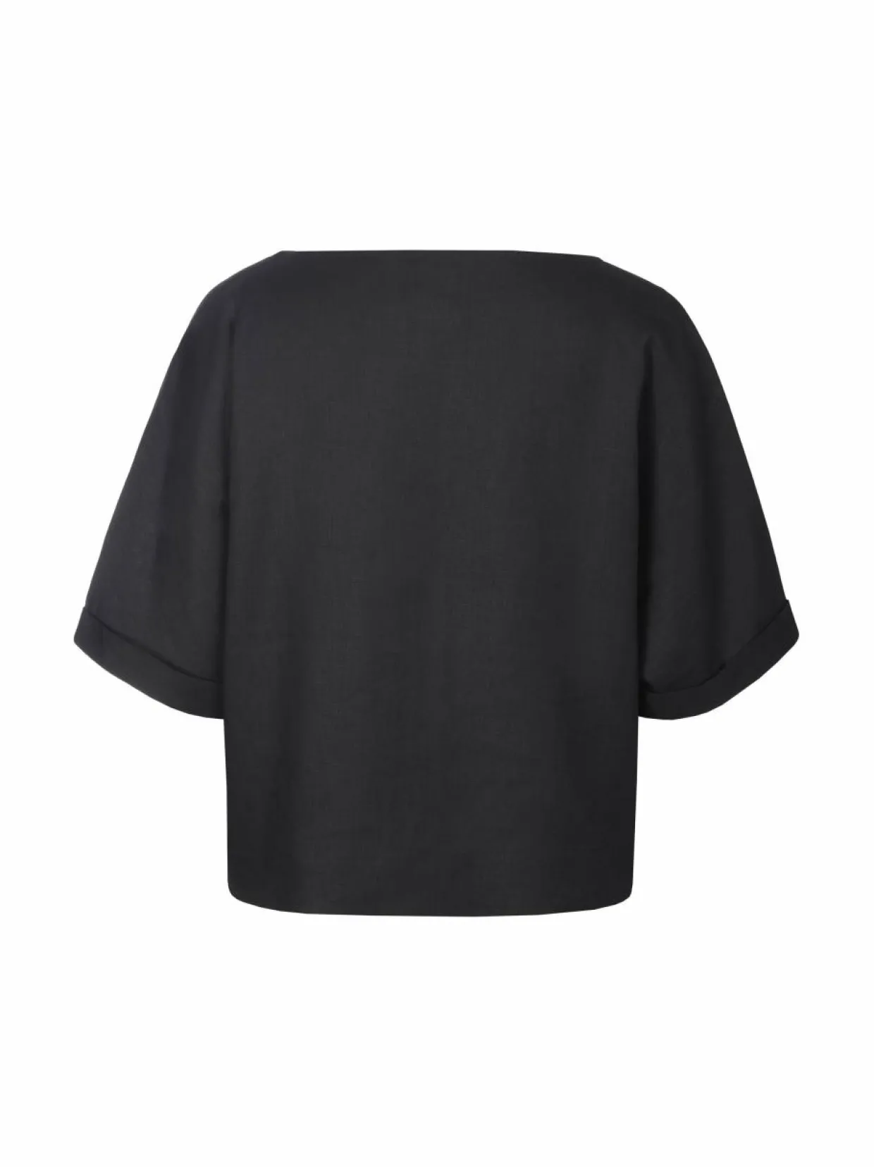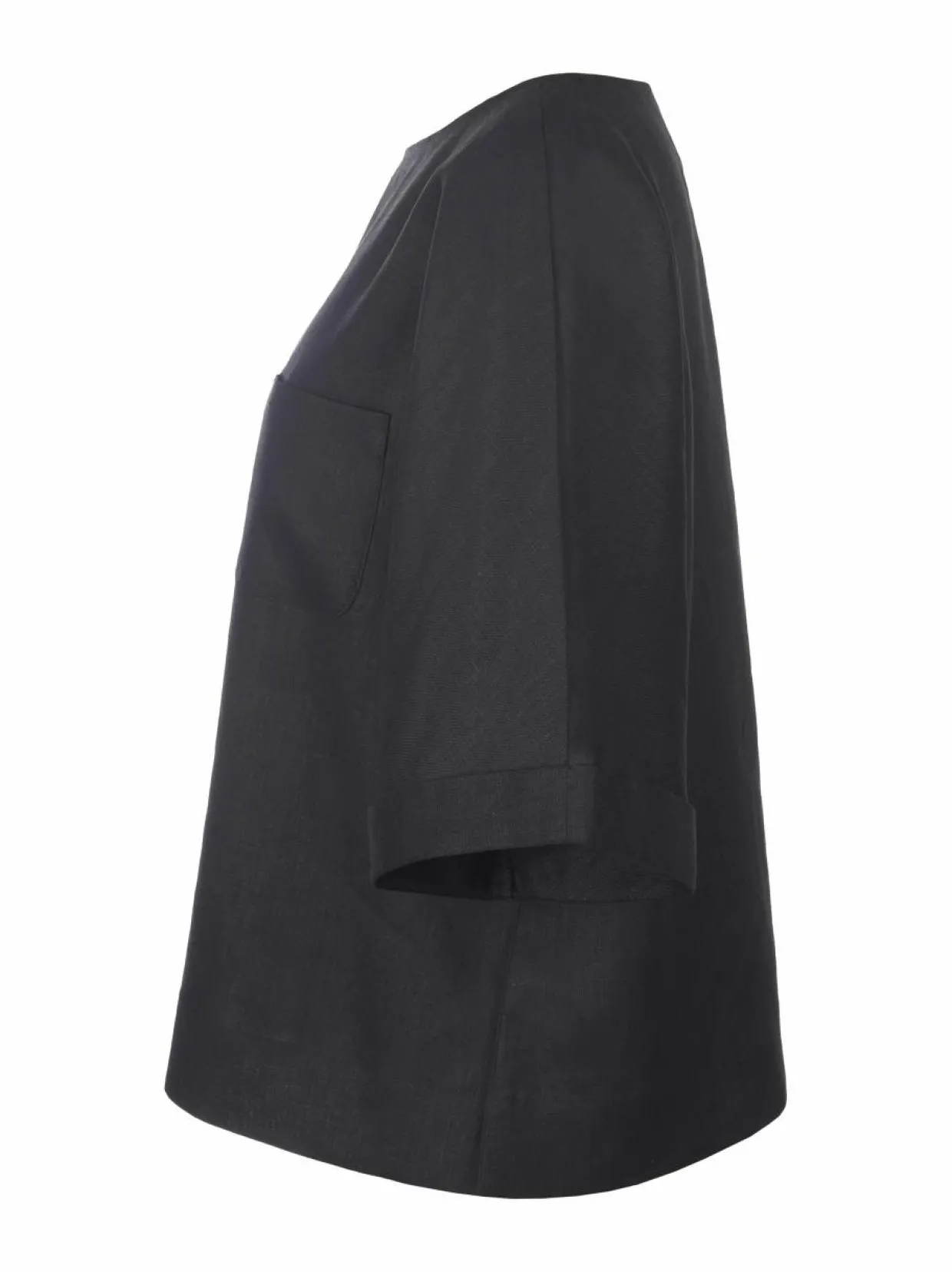 Kesäinen ja kevyt pellavapusero, jossa on väljä boksimainen siluetti, venepääntie ja kyynärpäämittaiset hihat. Yksityiskohtana koristetasku edessä ja leveät känteet hihansuissa ja helmassa. Tämän vuorittoman puseron takapituus on 56 cm koossa 36.