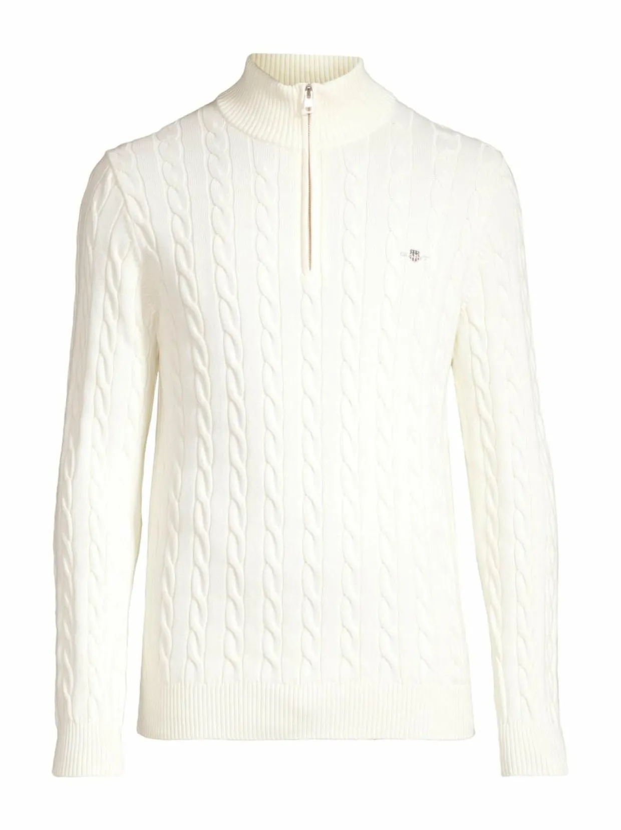 Gantin palmikkoneule on sataprosenttista puuvillaa. Neuleessa on korkea vetoketjukaulus ja ikoninen Archive-vaakunakirjailu rinnassa. Pääntiellä, helmassa ja hihansuissa on resorit.