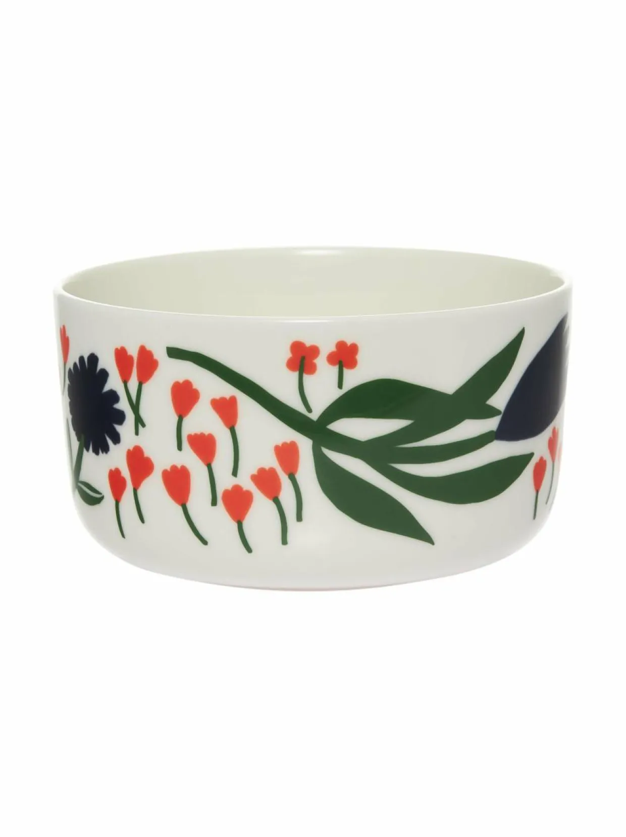 Marimekon Palsta-Kulhoa koristaa kukkakuvio rohkealla väriyhdistelmällä. Suunnittelija Lotta Maija on ammentanut inspiraatiota Palstan energiseen kuvioon kesämökin kukkapenkkien kasveista.