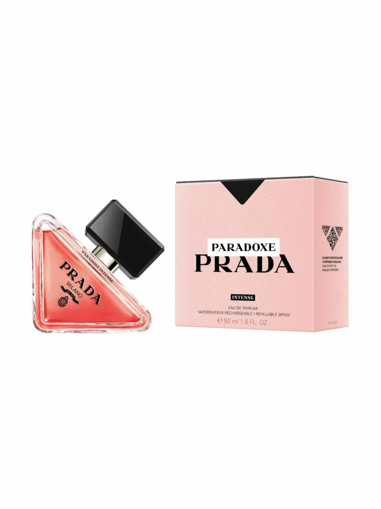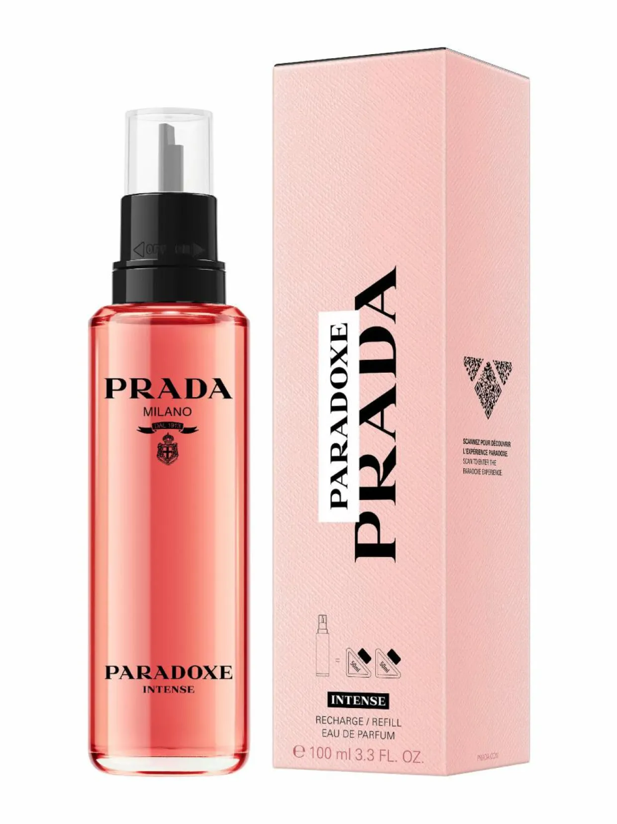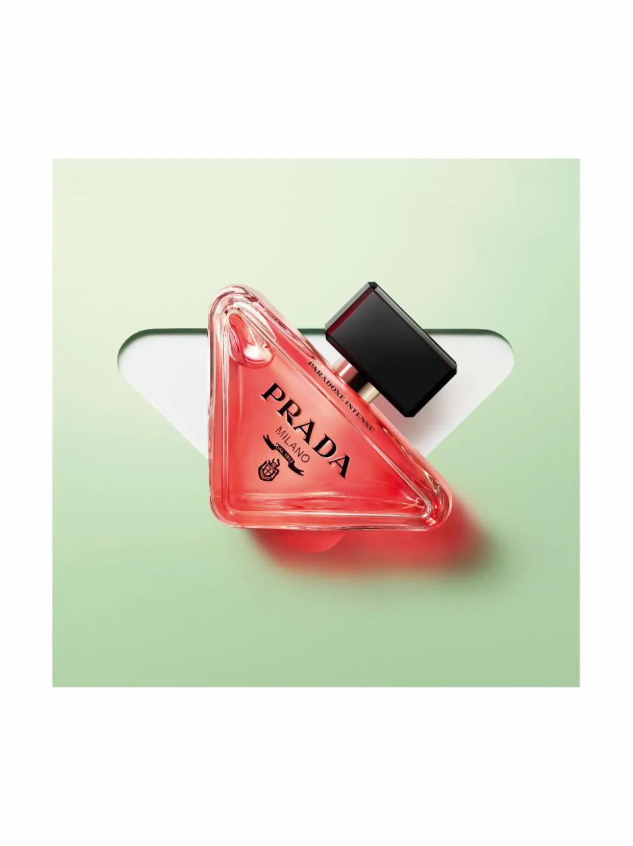 PULLO: HERKKÄ, MUTTA KAPINALLINENAlkuperäisen nimikkopullon tavoin Paradoxe Intensen päivitetty pullo ilmentää Pradan uudistumisen ydintä ja rakkautta kontrasteihin. Toisin kuin perinteinen pullomuotoilu, tämä pullo on ensisilmäyksellä minimalistinen ja herkkä. Se on saanut inspiraationsa alkuperäisestä ikonisesta Prada-kolmiologosta, joka on kapinallisesti suunniteltu lepäämään sivulla. Pradan vaakunalogo on vastakohtana tuoksun syvälle vaaleanpunaiselle värille. Pullon yläreunassa on ”Paradoxe Intense” -viiste.