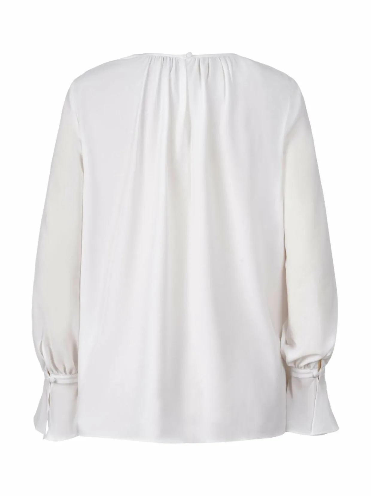 Ilmavan kevyt paita, jossa on liehuvat hihansuut napillisilla rannekkeilla ja kauniisti poimutetettu pääntie. Yksityiskohtana niskassa aistillinen halkio ja silmunapitus. Väljän, miehustasta vuoritetun mallin päällysmateriaalina on läpikuultava polyesterisifonki. Takapituus on 64 cm koossa 36.