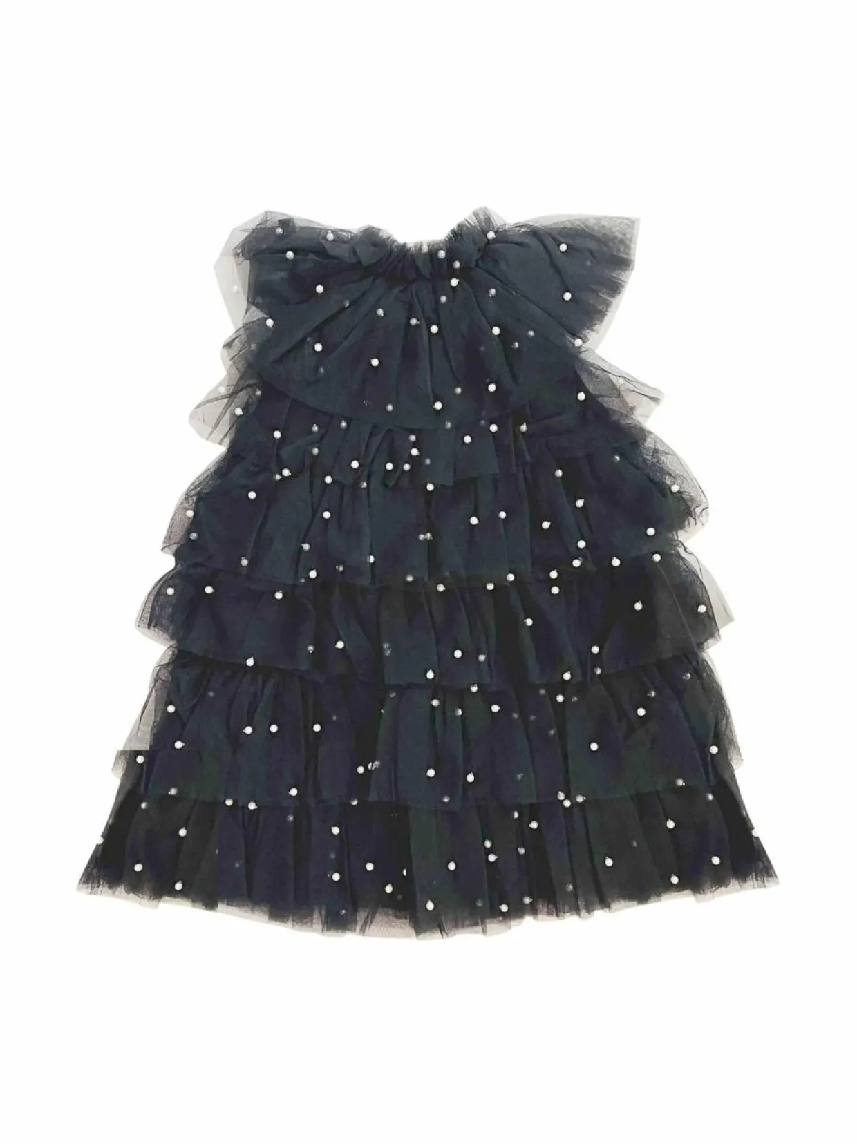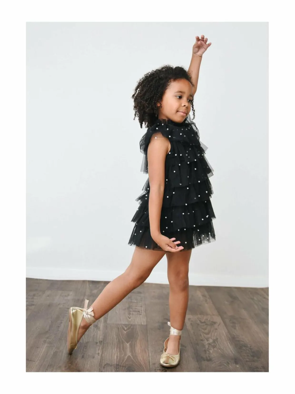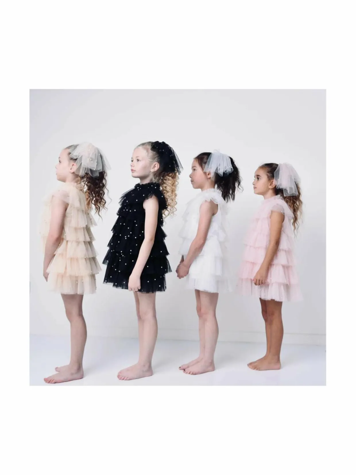 Ihastuttava hihaton tyllimekko kaikille pikkuprinsessoille. Upea tylliunelma, jonka sävymaailma on dramaattinen ja viimeiltelty kauniisti kauttaaltaan helmillä. Mekon helma on runsas ja a-linjainen, useilla tyllikerroksilla, jotka tuovat volyymia asuun. Myös pääntie on viimeistelty tylliröyhelöllä.
