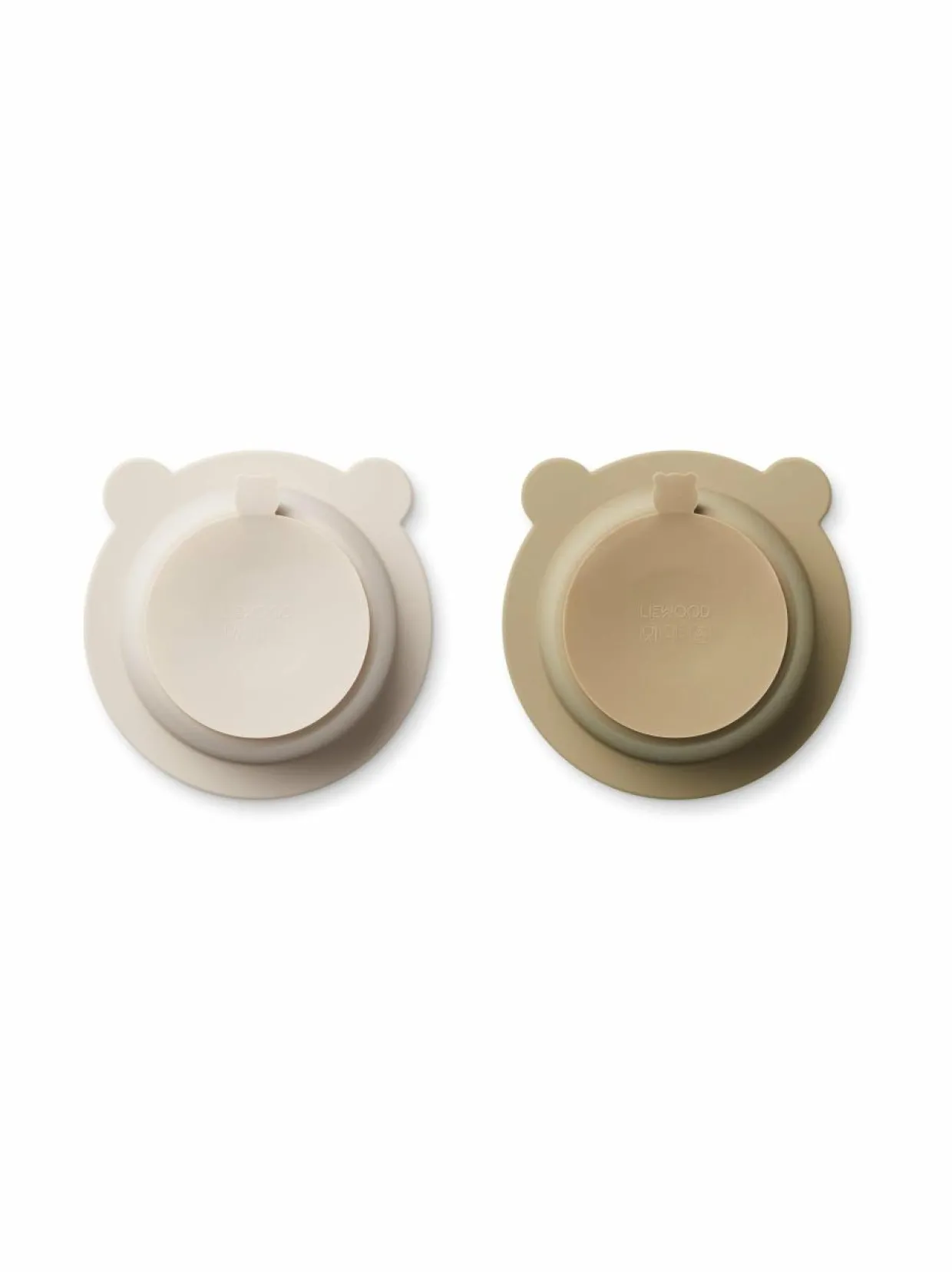 Liewood Peony -kulhopakkaus sisältää kaksi erisävyistä syvää lautasta. Kulhon pohjassa on imukuppi, jonka avulla astia pysyy kiinni pöydässä. Silikoniset kulhot ovat kestäviä, pehmeitä ja kevyitä. Mitat: Halkaisija 16 cm ja korkeus 5,3 cm. Tilavuus 500 ml.