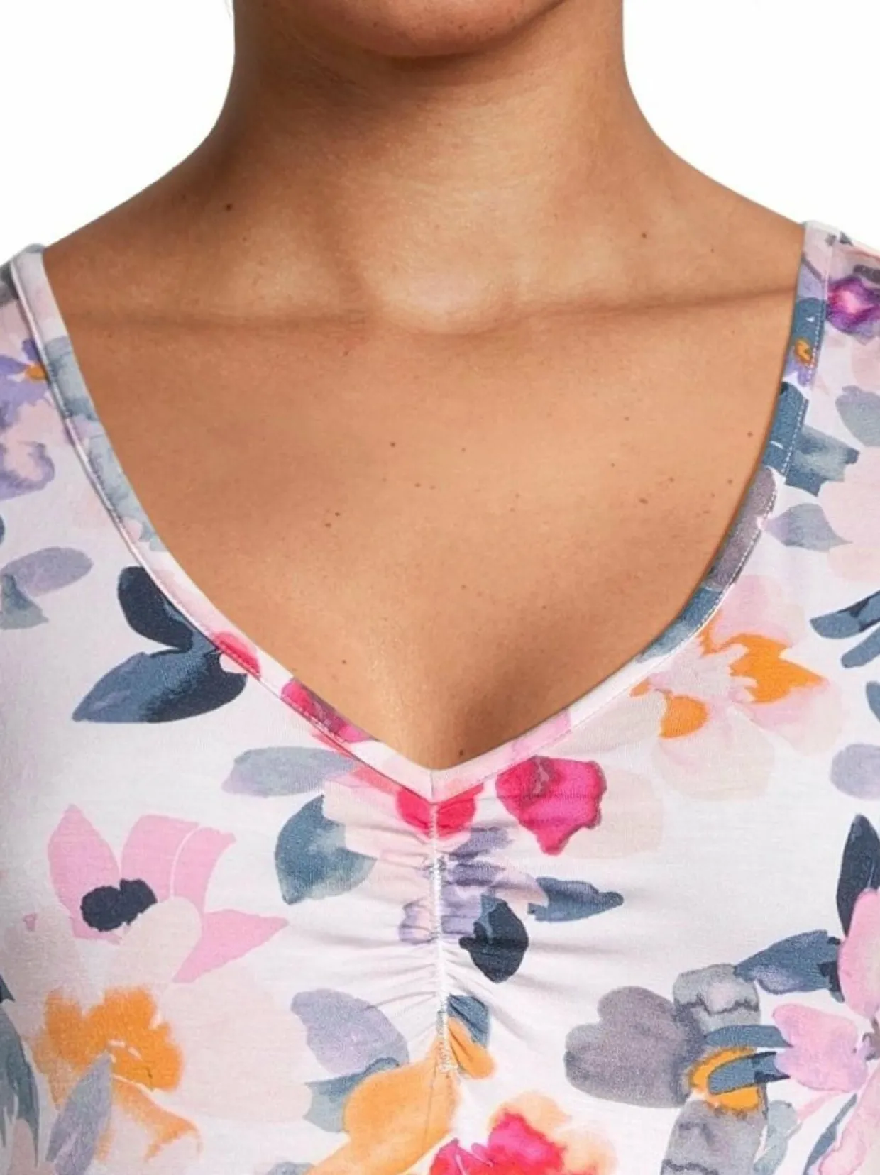 Damellan hihaton yöpaita on valmistettu pehmeästä ja hengittävästä modaalista, johon on lisätty myös elastaania tuomaan joustoa. Yöpaidassa on kaunis V-pääntie ja rypytyksiä miehustassa. Sen sivuhelmassa on halkiot. Vaatteen pituus on noin 98 cm.