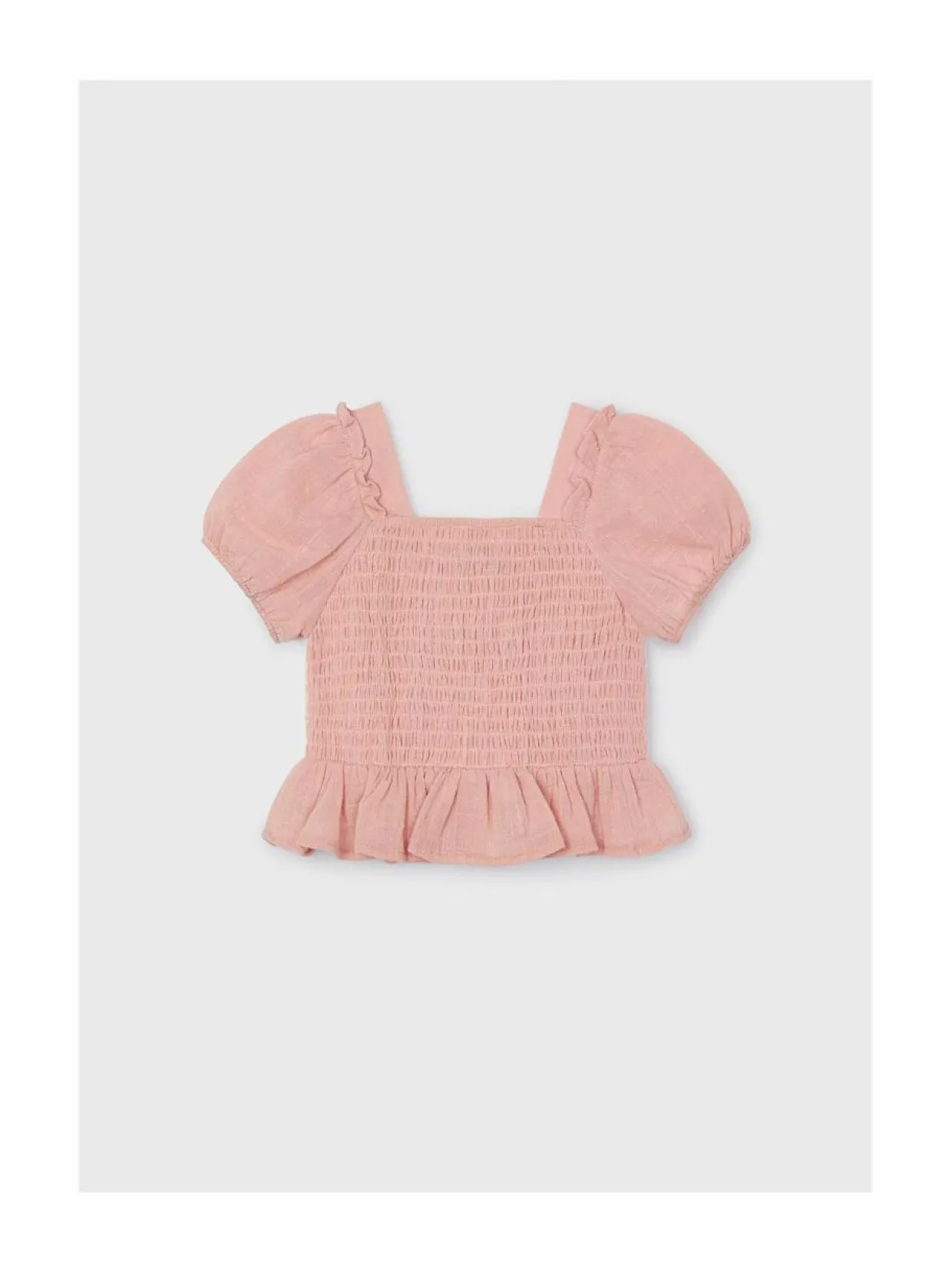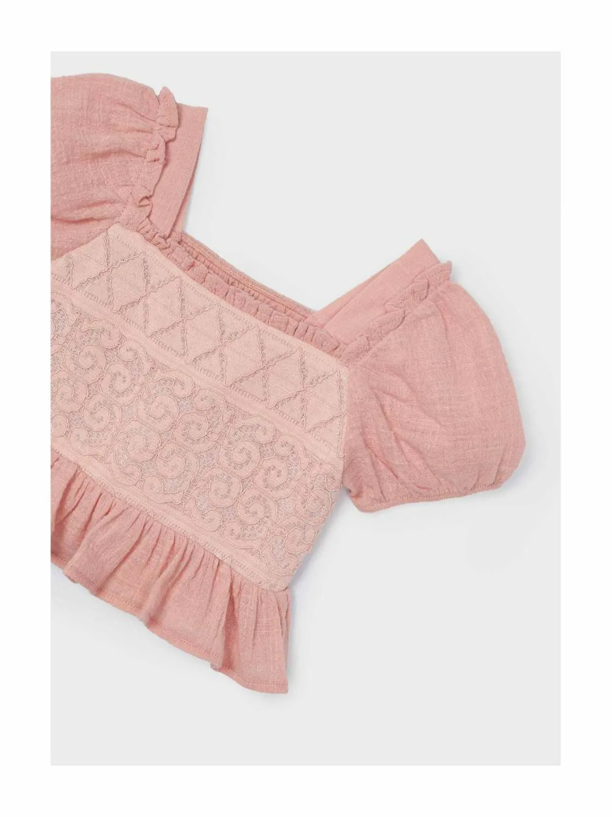 Juhlava röyhelösomisteinen pusero puhvihihoilla. Etupuolella kaunis pitsibrodeeraus. Takana joustavaa smokkirypytystä. Korkean puuvillapitoisuuden ansiosta materiaali on hengittävää ja ihoystävällistä.