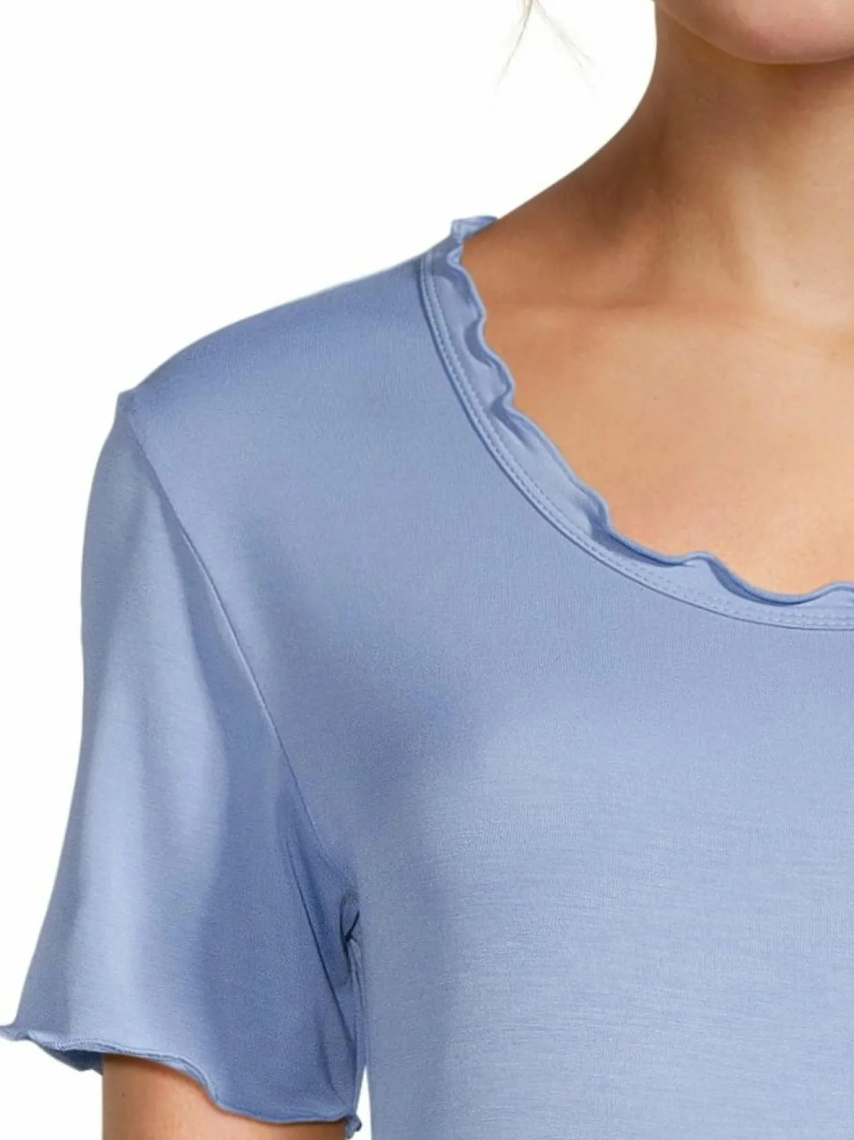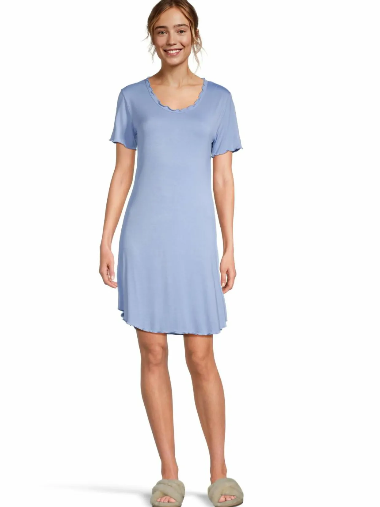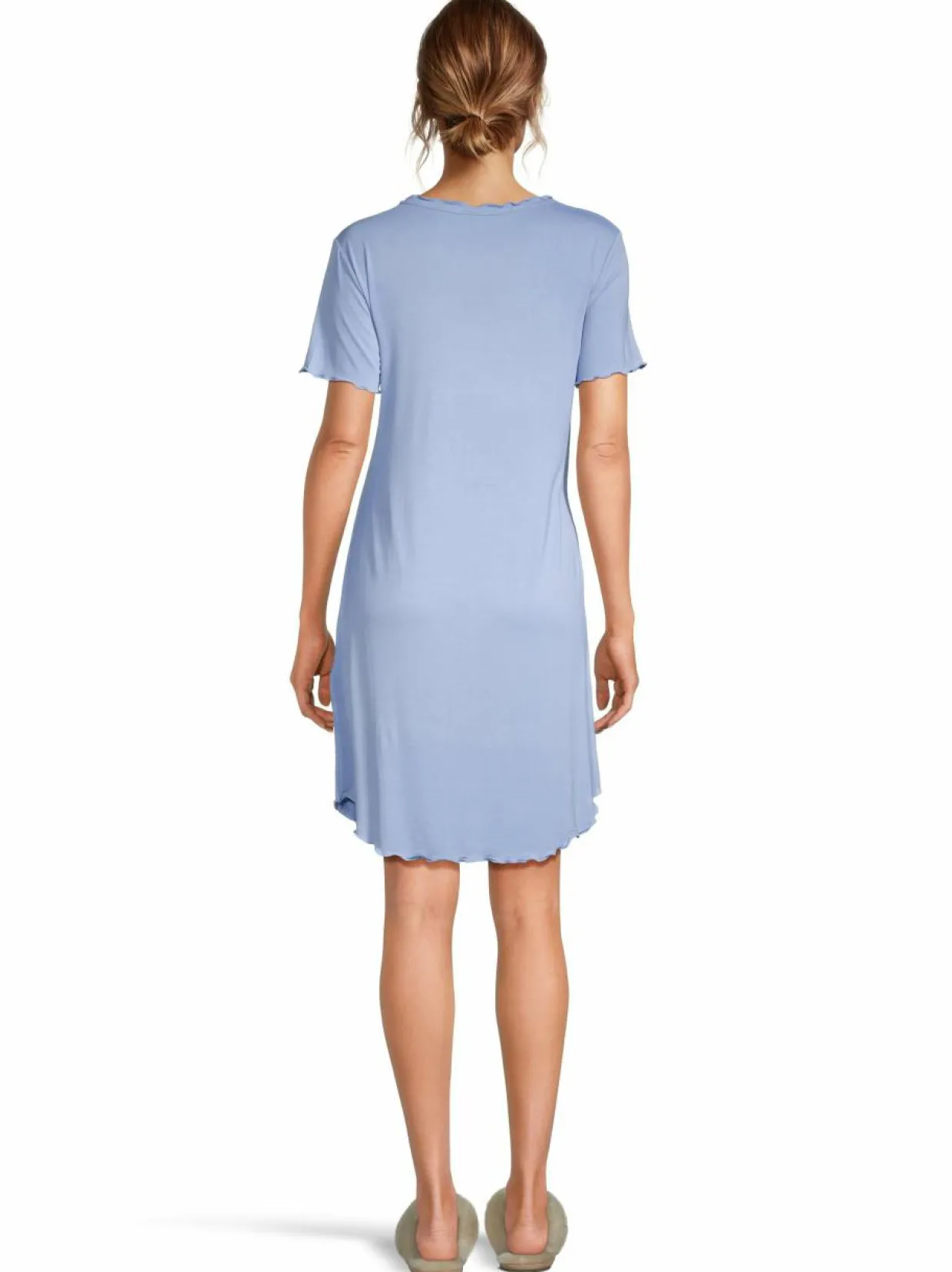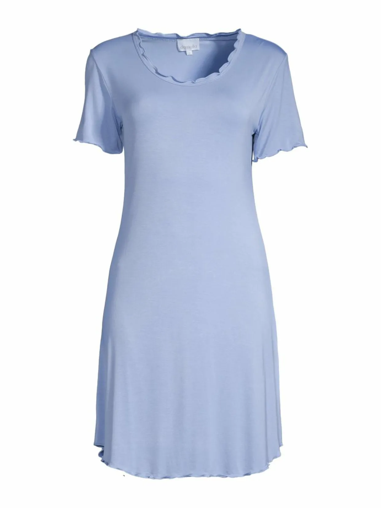 Pehmeän tuntuisesta bambuviskoosista valmistettu lyhythihainen yöpaita Damellalta. Materiaaliin on lisätty myös elastaania tuomaan joustoa. Pääntiellä, helmassa sekä hihansuissa on hieno aaltoileva reunus.