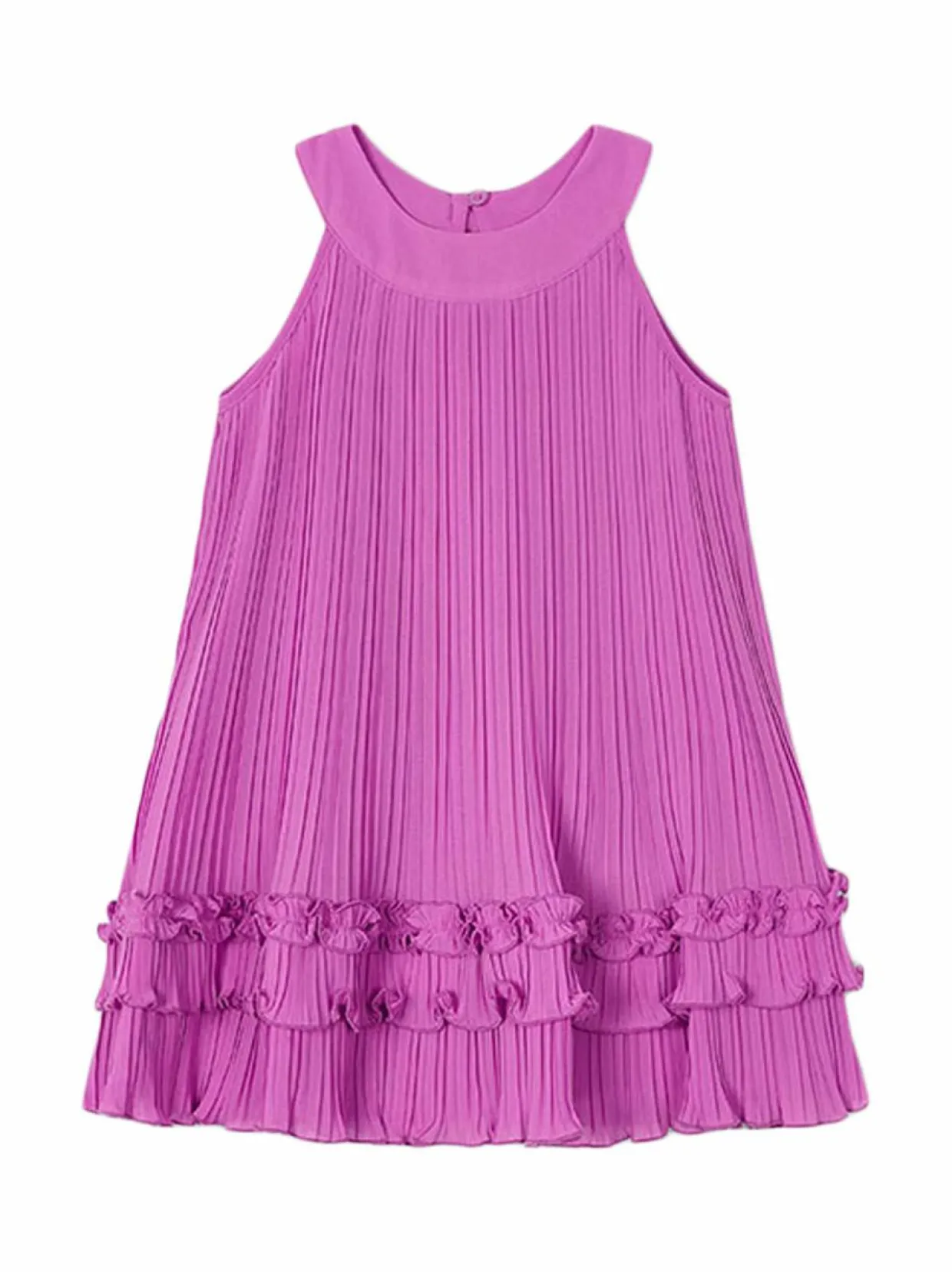 Kaunis pliseerattu mekko Mayoralilta on valmistettu 100 % polyesteristä. Mekossa on kaksi kerrosta röyhelöitä helmassa. Mallissa on pyöreä pääntie ja niskassa on napilla kiinnitettävä pisara-aukko sekä rusetti. Mekko on mukava ja helppo pukea päälle. Mekko sopii täydellisesti juhliin ja muihin erityistilaisuuksiin.