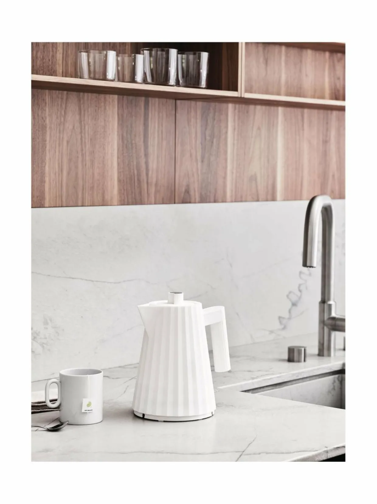 Veistosmaisen Alessi Plissé -vedenkeittimen pinta on kuin laskostettua kangasta. Kauniin vedenkeittimen jättää mielellään näkyville keittiötasolle. Michele De Lucchin suunnittelema vedenkeitin on valmistettu termoplastisesta hartsista. Vedenkeittimen tilavuus on 1 l ja teho 2200-2400 W. Takuu 24 kk.