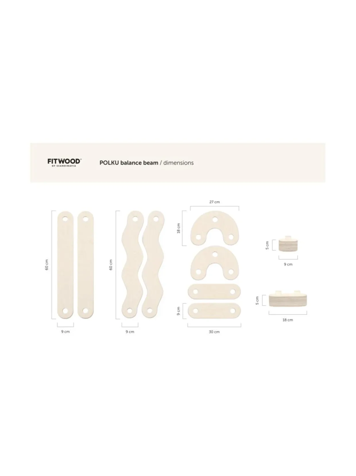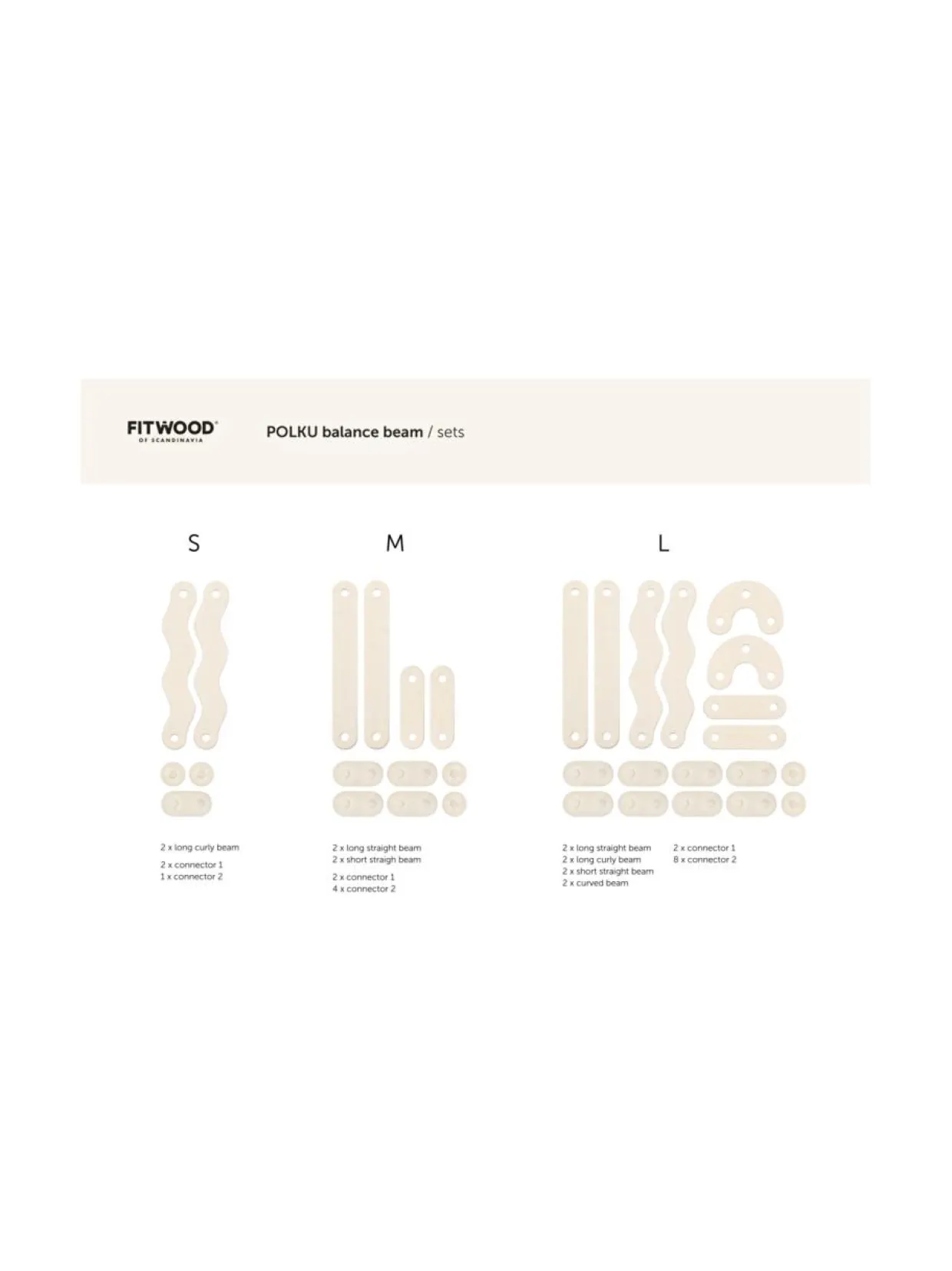 POLKU tasapainorataa on saatavilla kolmena eri kokoisena settinä – S, M ja L. Kaikki setit koostuvat erilaisista puomeista ja välikappaleista. Puomeja on yhteensä neljää erilaista: pitkä suora, lyhyt suora, pitkä kiemurteleva ja kaareva. Välikappaleita on kahta erilaista ja niitä voi pinota päällekkäin korkeampien ratojen tekemiseksi.