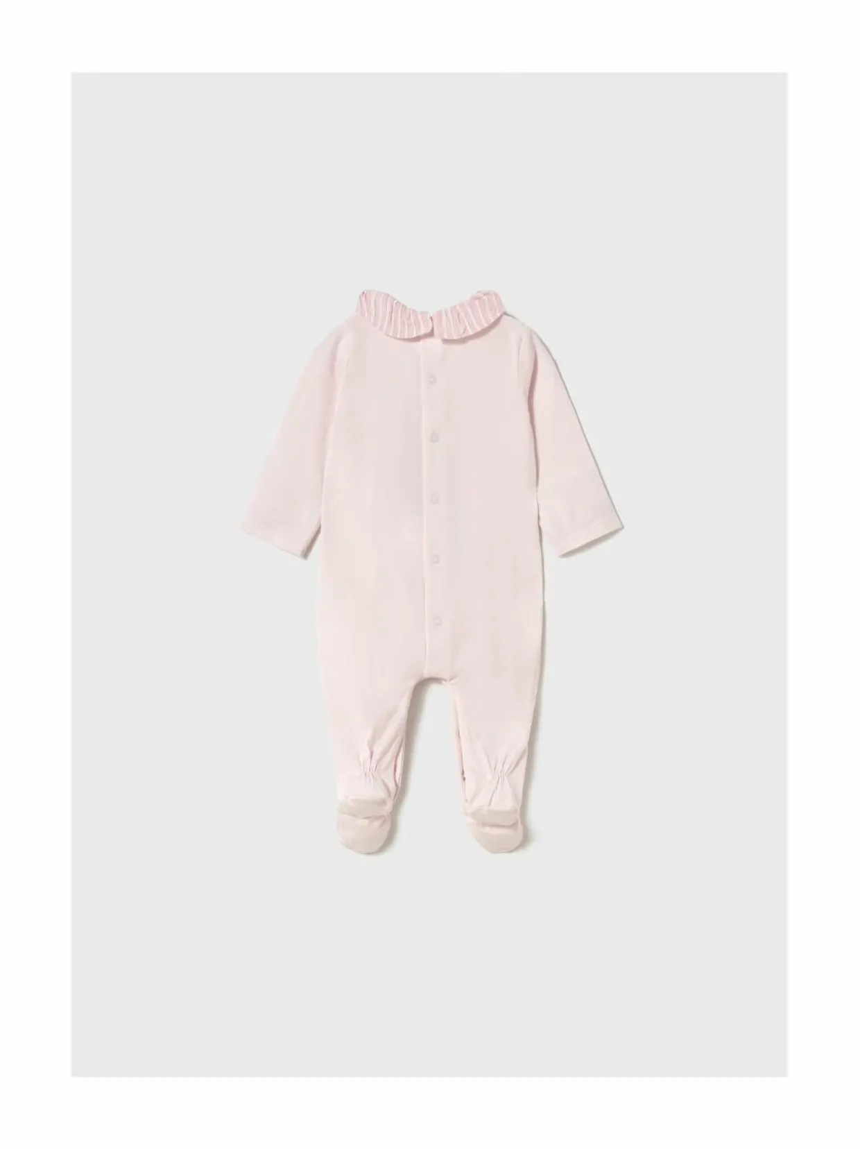 Pitkähihainen potkupuku vauvalle, jossa on kaunis pitsikoristeinen kaulus ja söpö applikaatio. Takana ja haaraosassa on painonapit, jotka tekevät puvusta helpon pukea ja riisua. Materiaali on mukavaa ja hengittävää puuvillasekoite.