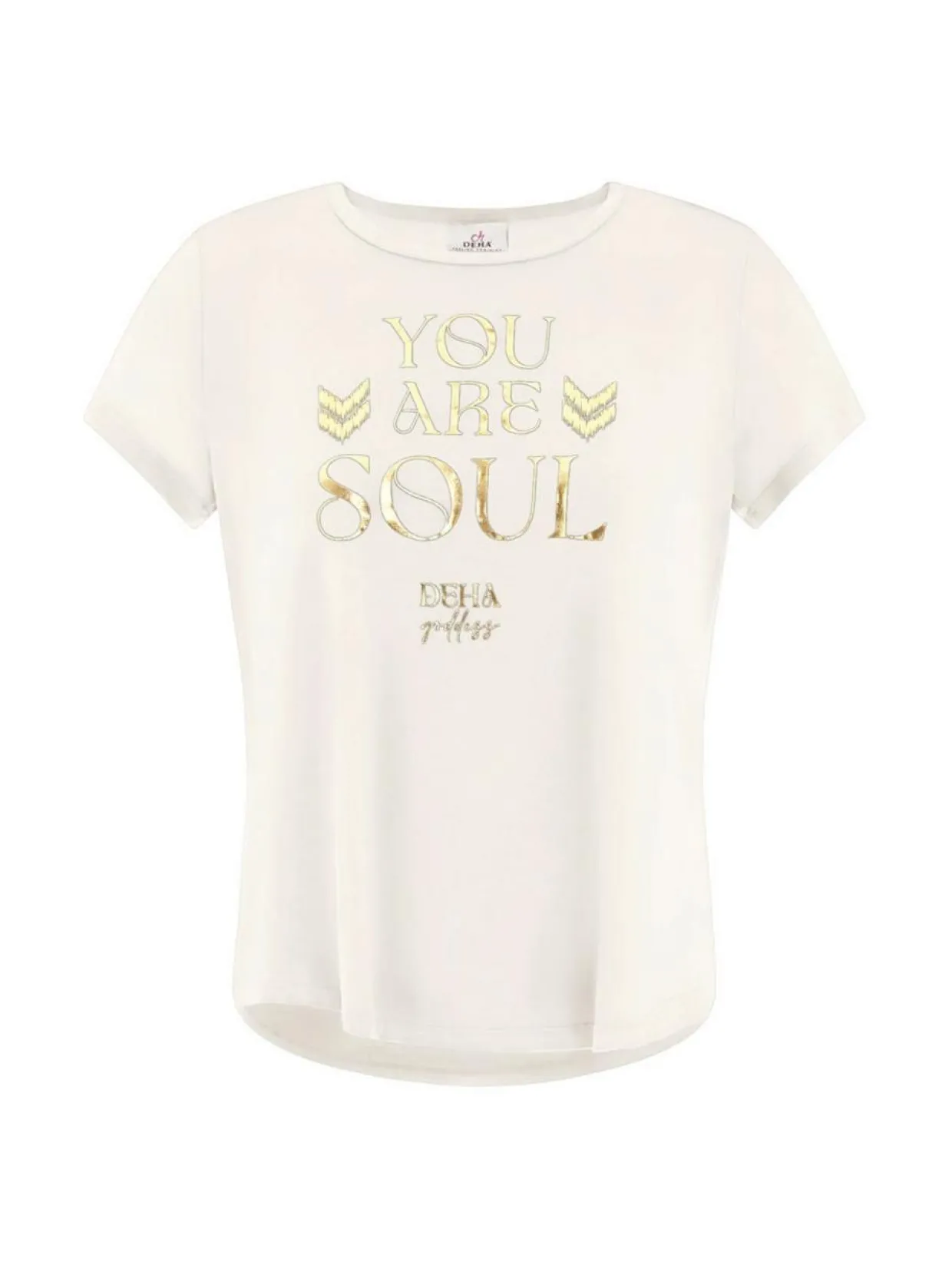 Dehan jooga t-paidassa on kultaisena hohtava kaunis printti. T-paita on täydellinen jokapäiväiseen pukeutumiseen ja valkoisen värinsä ansiosta se on helppo yhdistää muiden vaatteiden kanssa. Kultainen printti erottaa paidan muista paidoista edukseen.