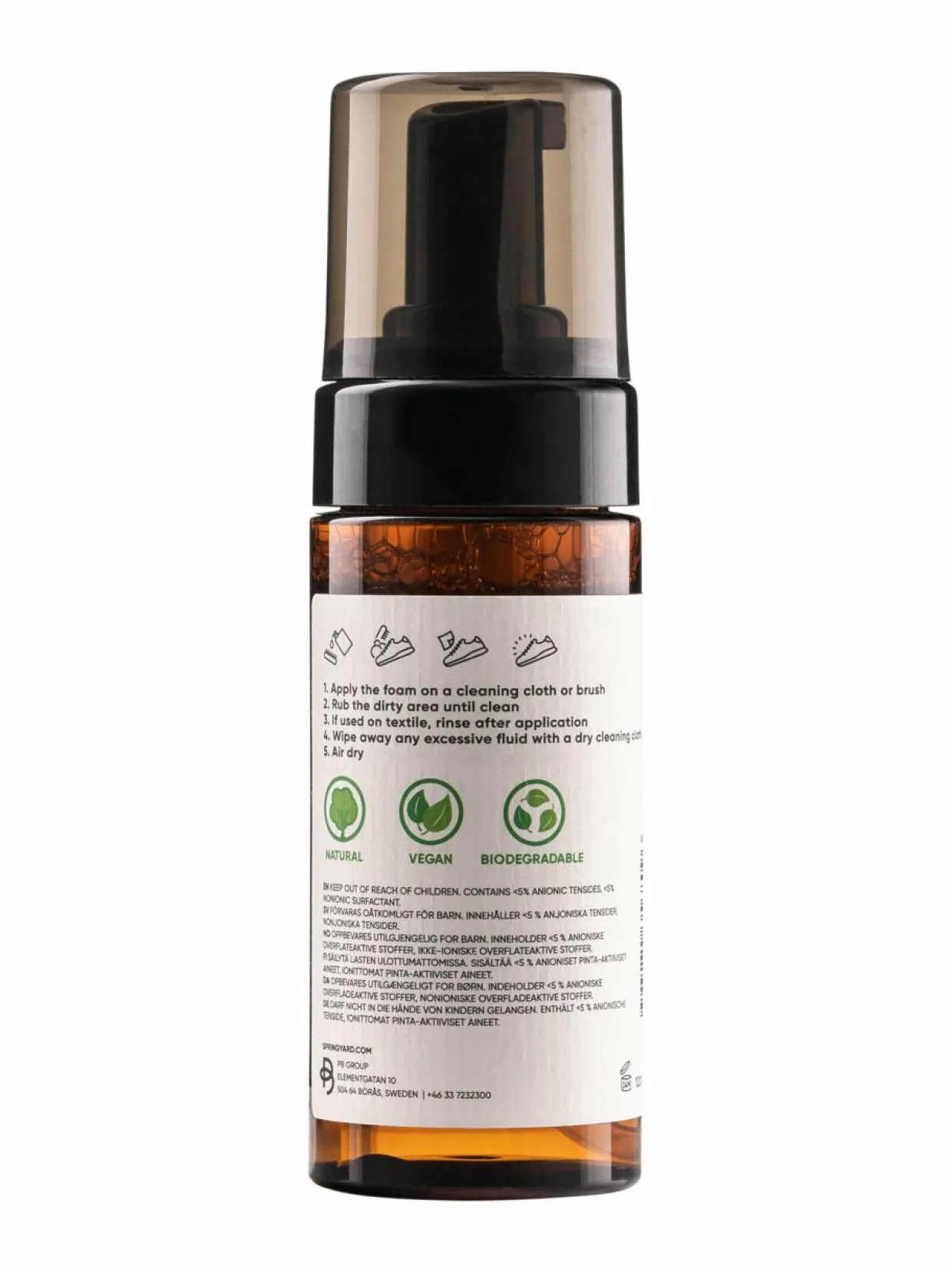 Ekologinen ja vesipohjainen puhdistusvaahto jalkineille. Helppokäyttöinen puhdistusaine, jota voit käyttää ilman vettä. Sopii kaikentyyppisille materiaaleille, erityisesti nupukille, mokkanahalle ja muille hienovaraisille materiaaleille.